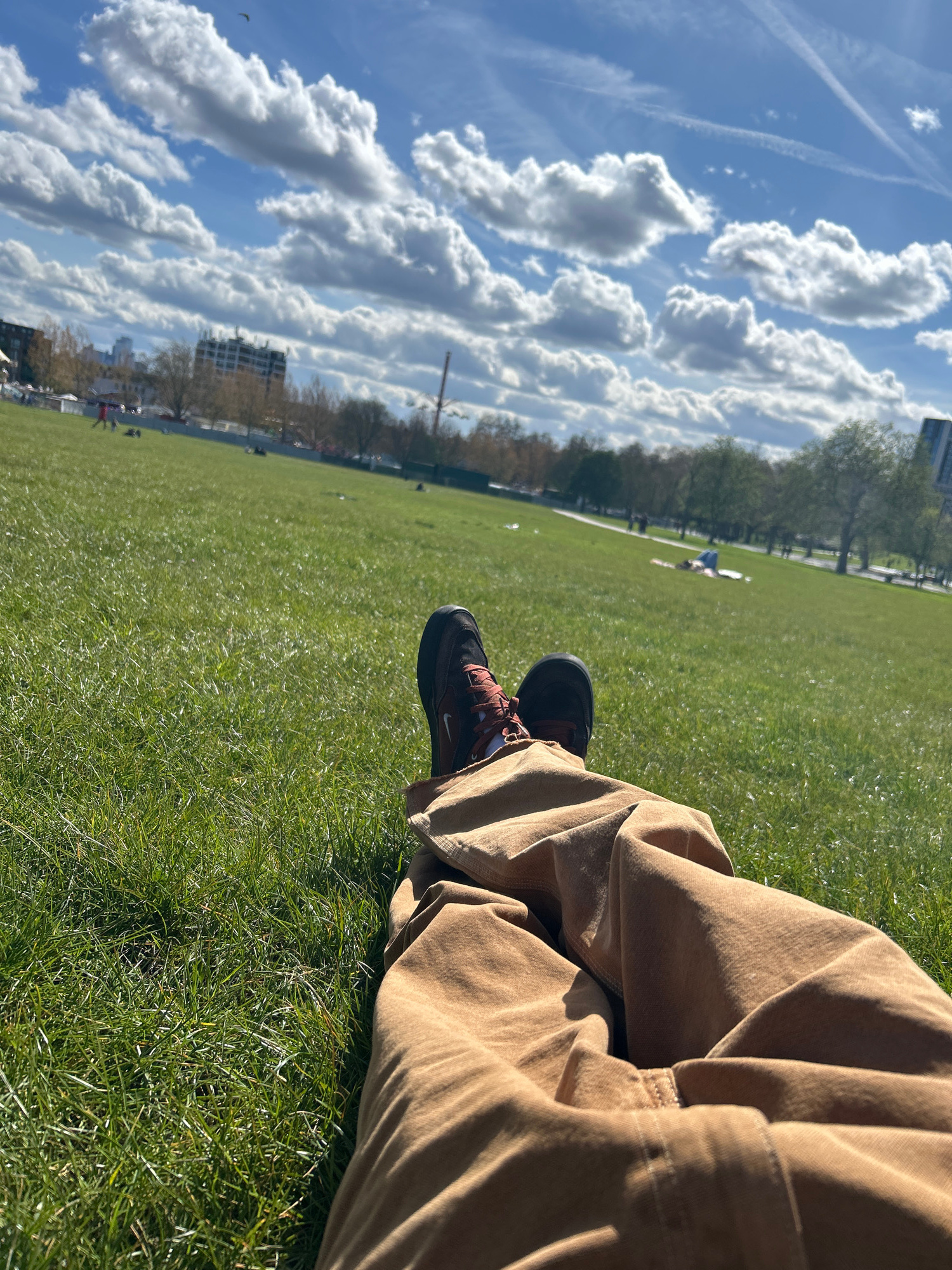 A low-angle, slightly tilted, outdoor shot depicts a person sitting on a lush green lawn on a sunny day, partially obscuring the surrounding environment. The person is wearing tan-colored, corduroy pa…read more