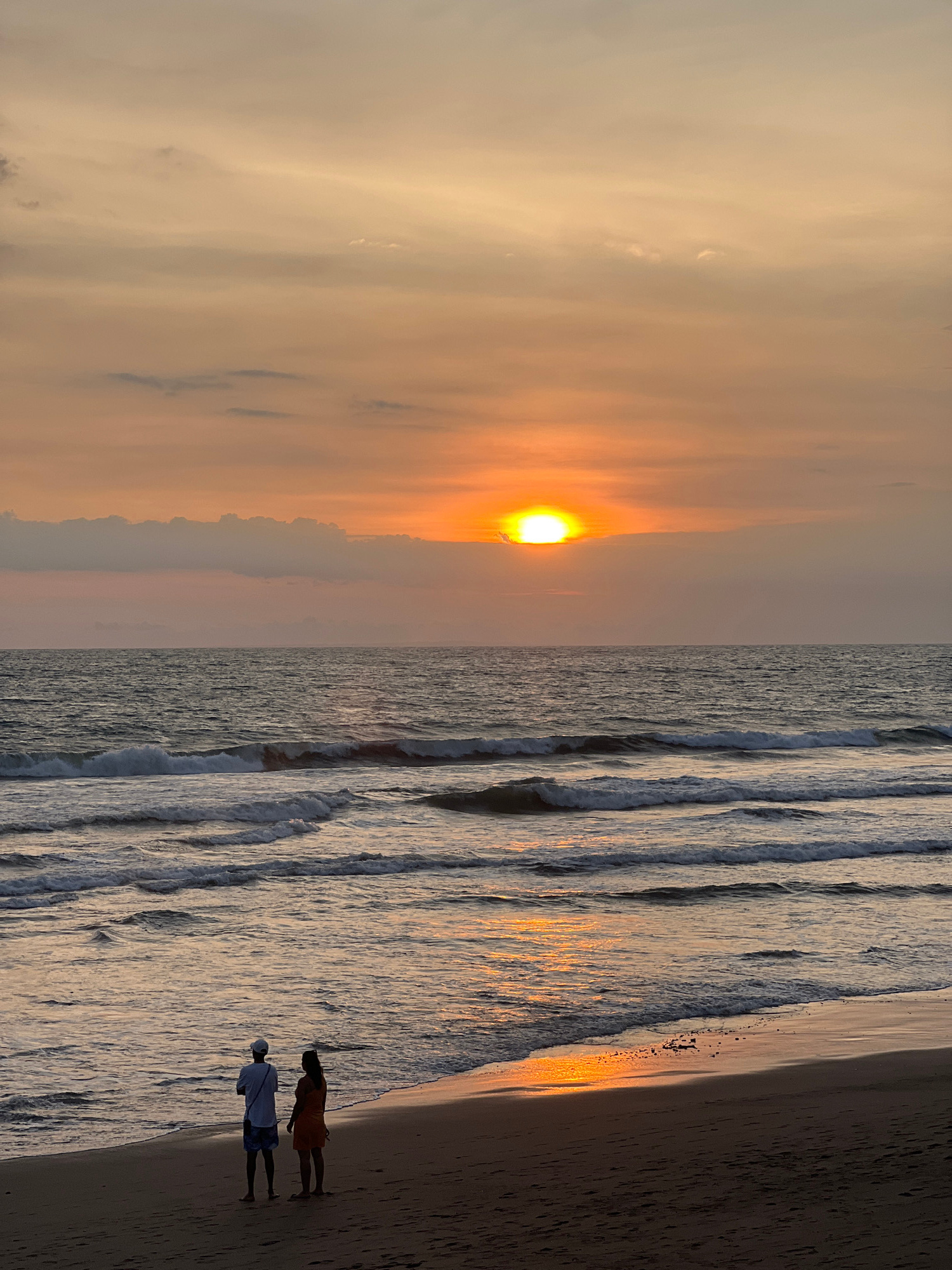 The scene depicts a sunset over a body of water, identified as the coast of Kerobokan Kelod, Indonesia. The sky occupies the upper portion of the frame, displaying a gradient of orange, yellow, and gr…read more
