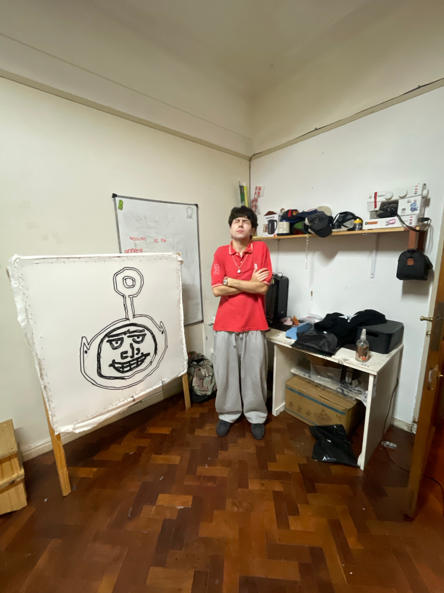 A person stands in a room with wooden parquet flooring and white walls. The person wears a red polo shirt and gray pants, and has their arms crossed. Behind them is a whiteboard and a piece of art pro…read more