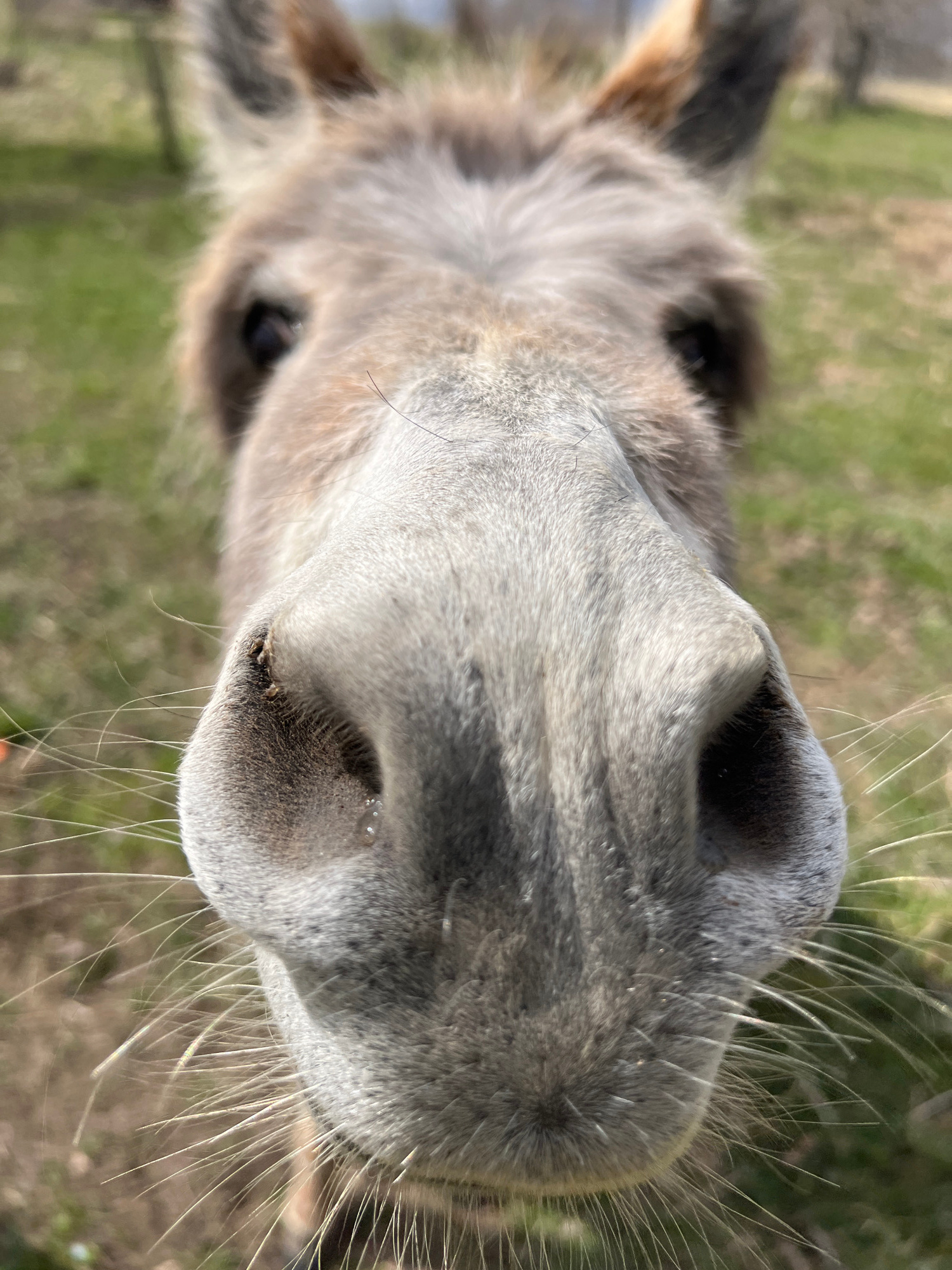 Close-up view of a donkey's muzzle, showing its nostrils, whiskers, and soft, gray fur. The donkey's eyes are visible in the background, slightly out of focus. The background suggests an outdoor setti…read more