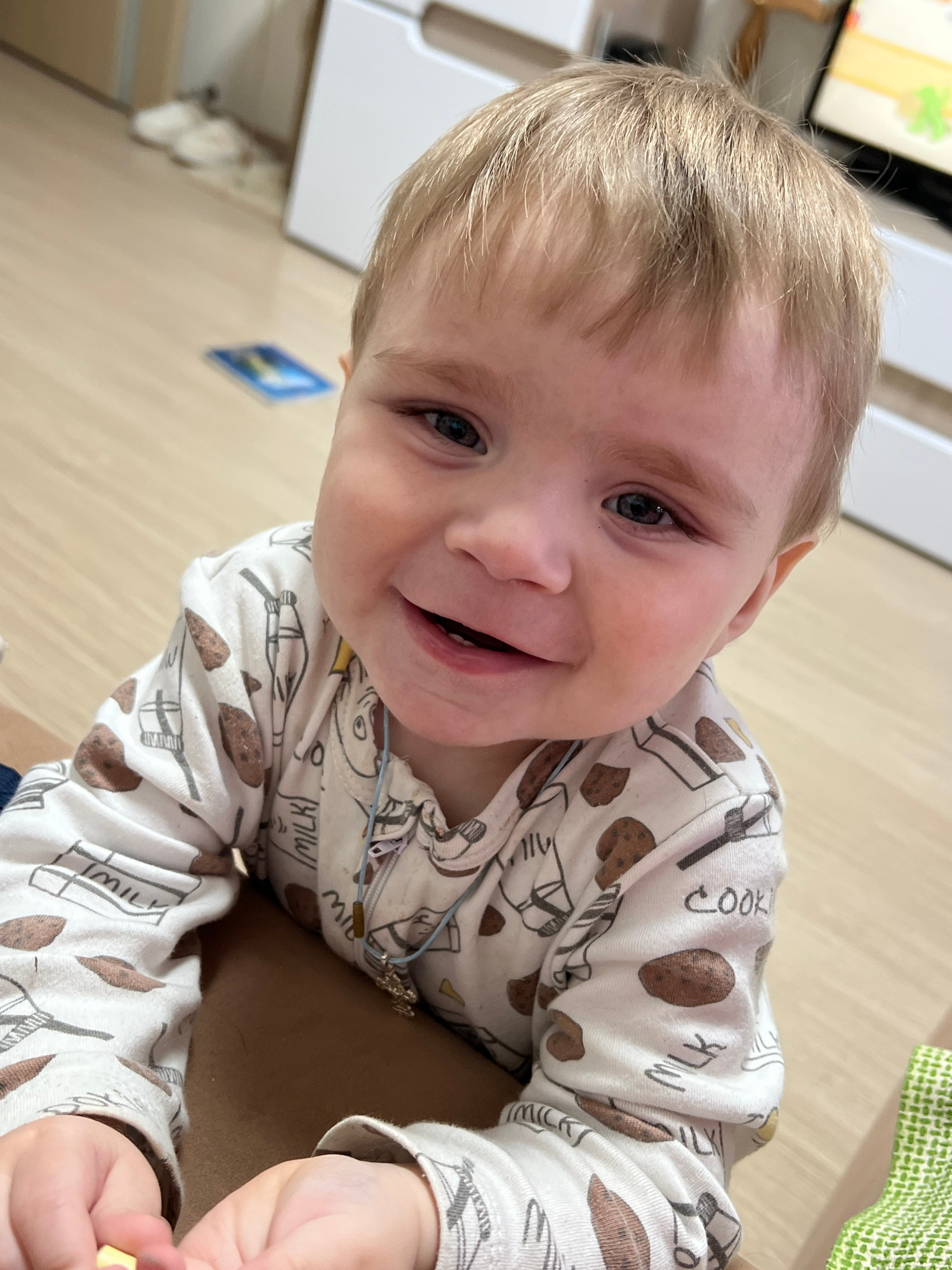 A young child is shown close-up, smiling and looking up at the camera. The child has light blond hair and blue eyes. The child is wearing a white pajama onesie with a repeating pattern of milk cartons…read more
