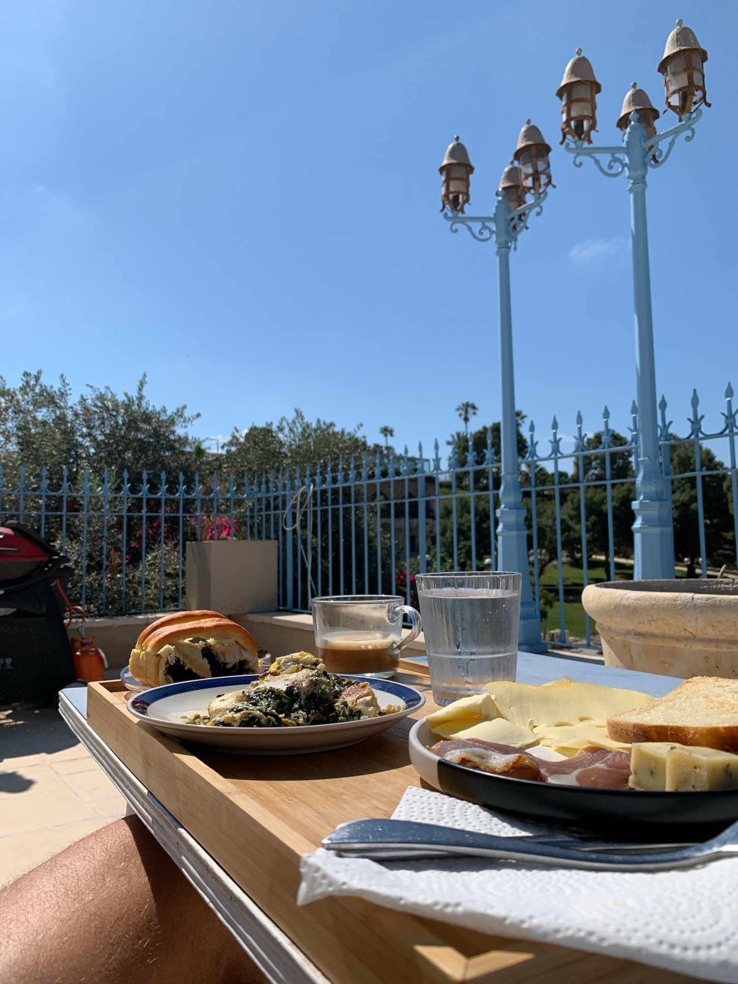 The image shows a meal served outdoors, likely on a balcony or patio, on a wooden tray. There is a plate with cheese and cold cuts, a small glass of a beverage, a plate with some type of stew or veget…read more