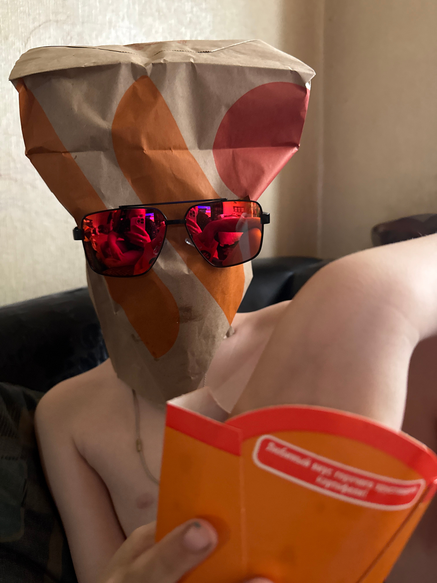 An indoor, close-up shot captures a person with light skin, partially visible from the chest up, holding a fast-food container. The individual's right arm and shoulder are visible, along with a thin c…read more