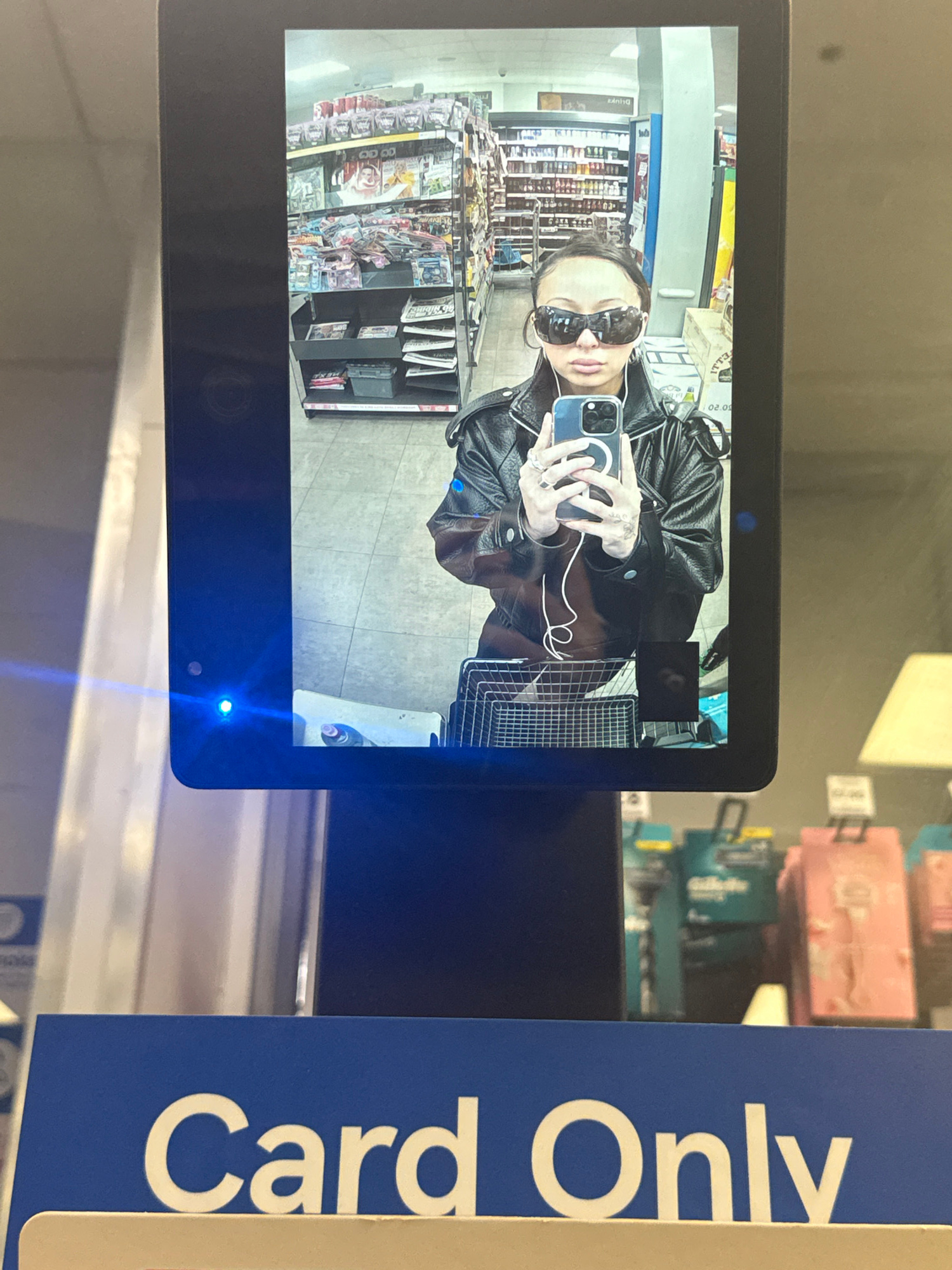 This image captures a person taking a selfie reflection in a vertical digital screen within a retail environment. The image itself is rotated 90 degrees clockwise, but when mentally re-oriented, the s…read more