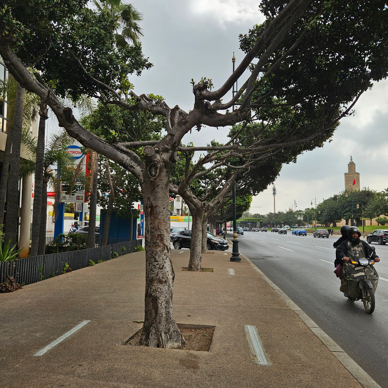 The image captures a street scene in Rabat, Morocco. A wide sidewalk lines the right of the frame, with a row of irregularly shaped trees casting shadows. A roadway runs parallel to the sidewalk, withβ¦read more