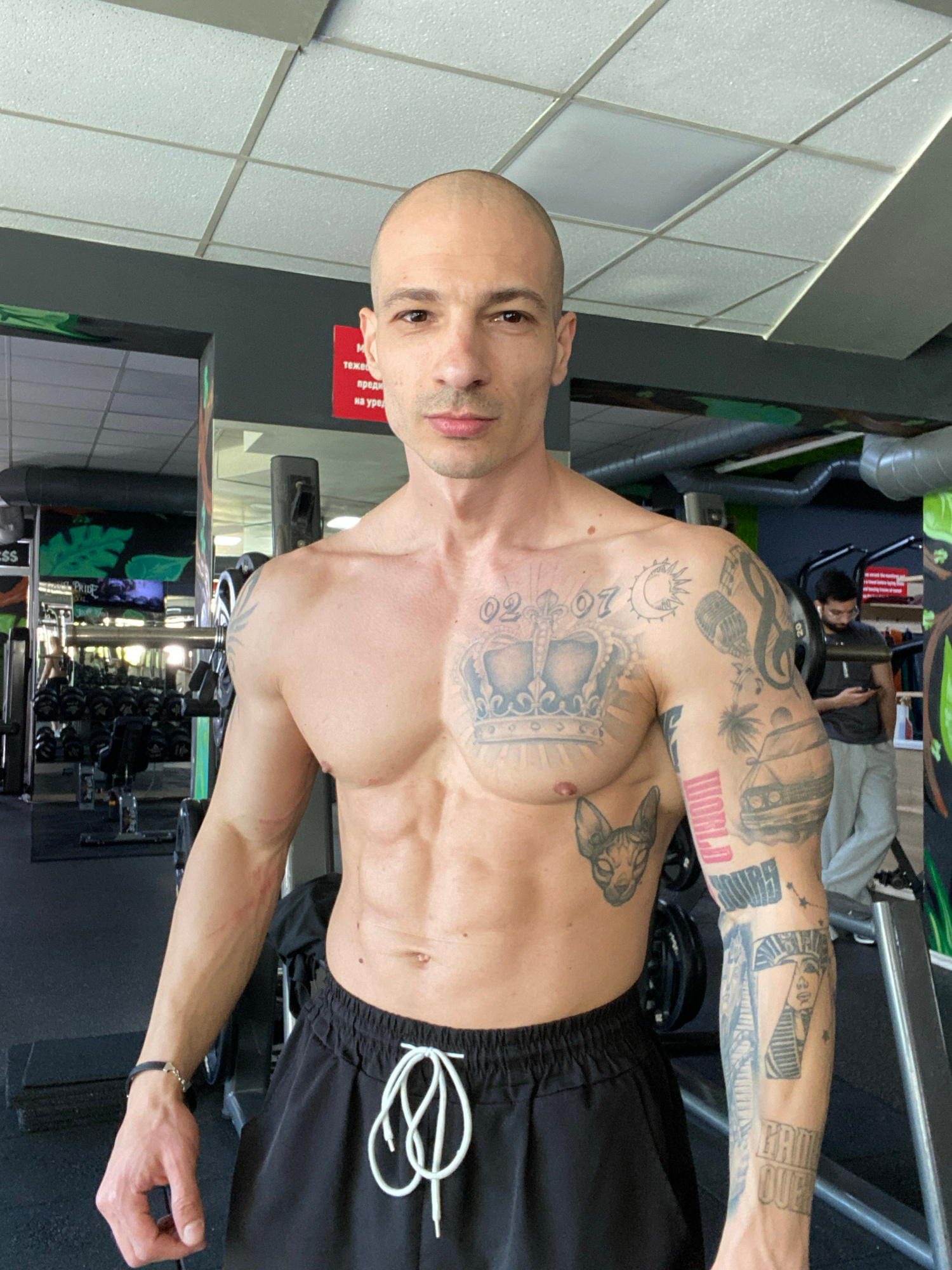 A shirtless muscular bald man with tattoos is posing in a gym. He is wearing black shorts with white drawstrings. The gym has various weight training equipment and dumbbells. The gym is located in the…read more