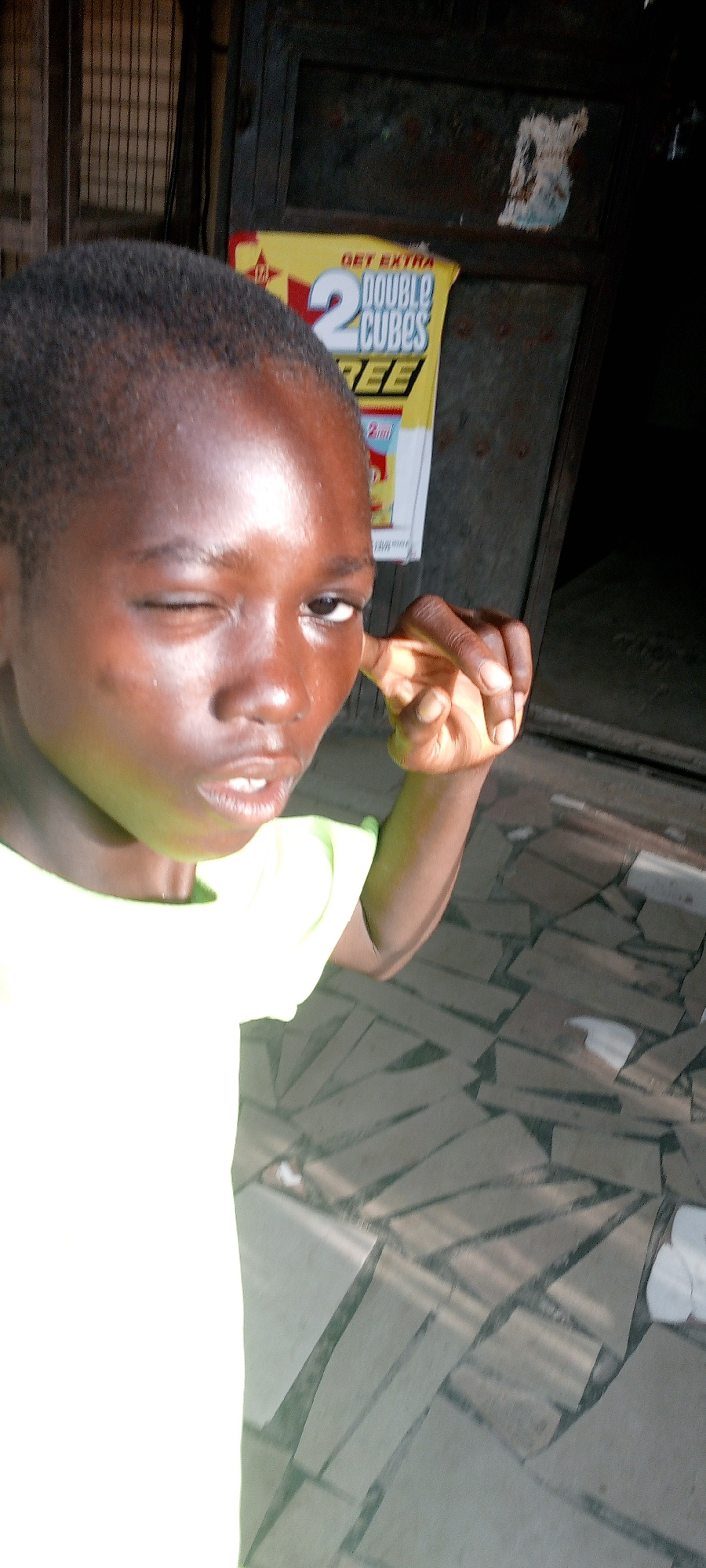 A young, dark-skinned male is making a face for the camera. He is winking one eye and holding his other ear. He is wearing a light-colored t-shirt. Behind him is an advertisement that reads "GET EXTRA…read more
