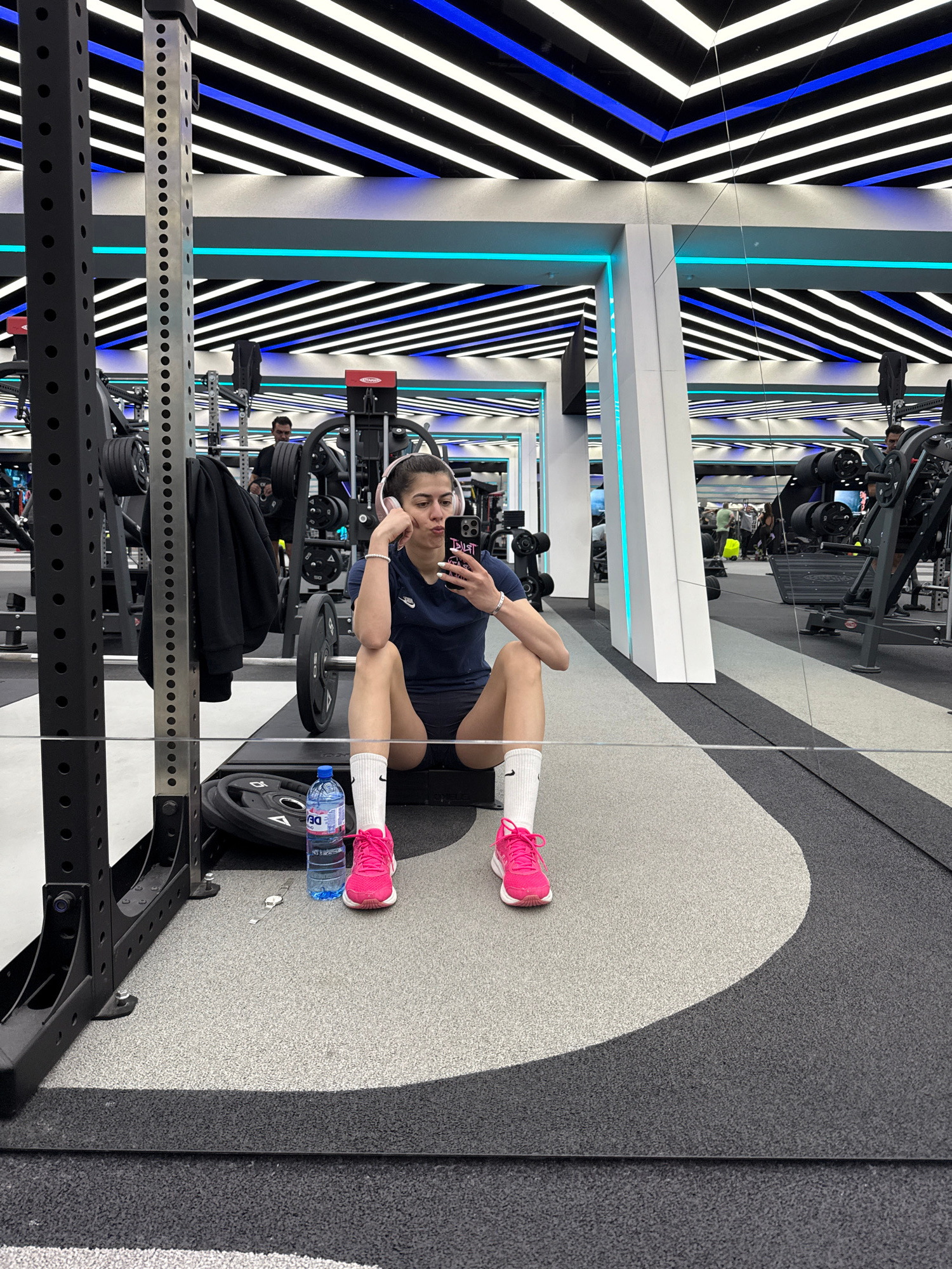 A gym setting in Sofia, Bulgaria shows a woman seated on the floor, facing a large mirror. She is wearing a dark blue athletic shirt, shorts, white socks, and bright pink sneakers. She holds a smartph…read more