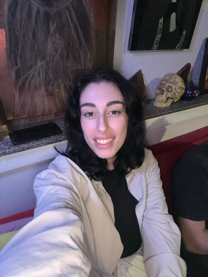 A young adult female with dark, wavy hair and fair skin is depicted from the chest up, smiling directly at the camera. She wears a black top beneath a light-colored, long-sleeved jacket. To her immedi…read more
