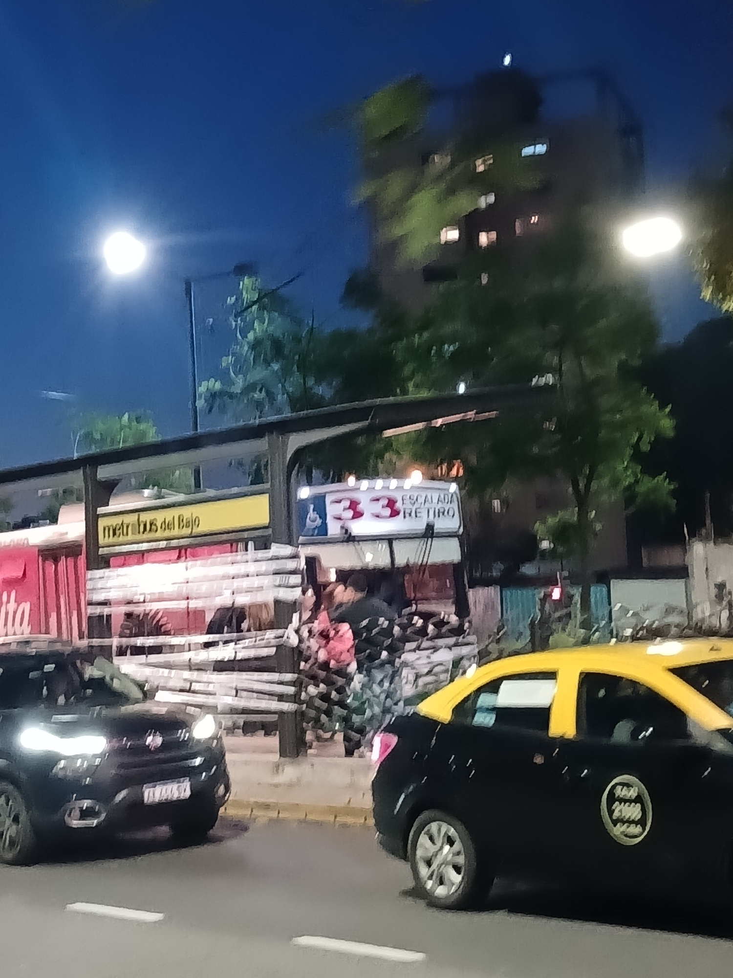 The image depicts a street scene in Buenos Aires, Argentina, at dusk or night. A yellow and black taxi is parked on the right side of the frame. A bus stop with advertisements and signs is visible. Th…read more