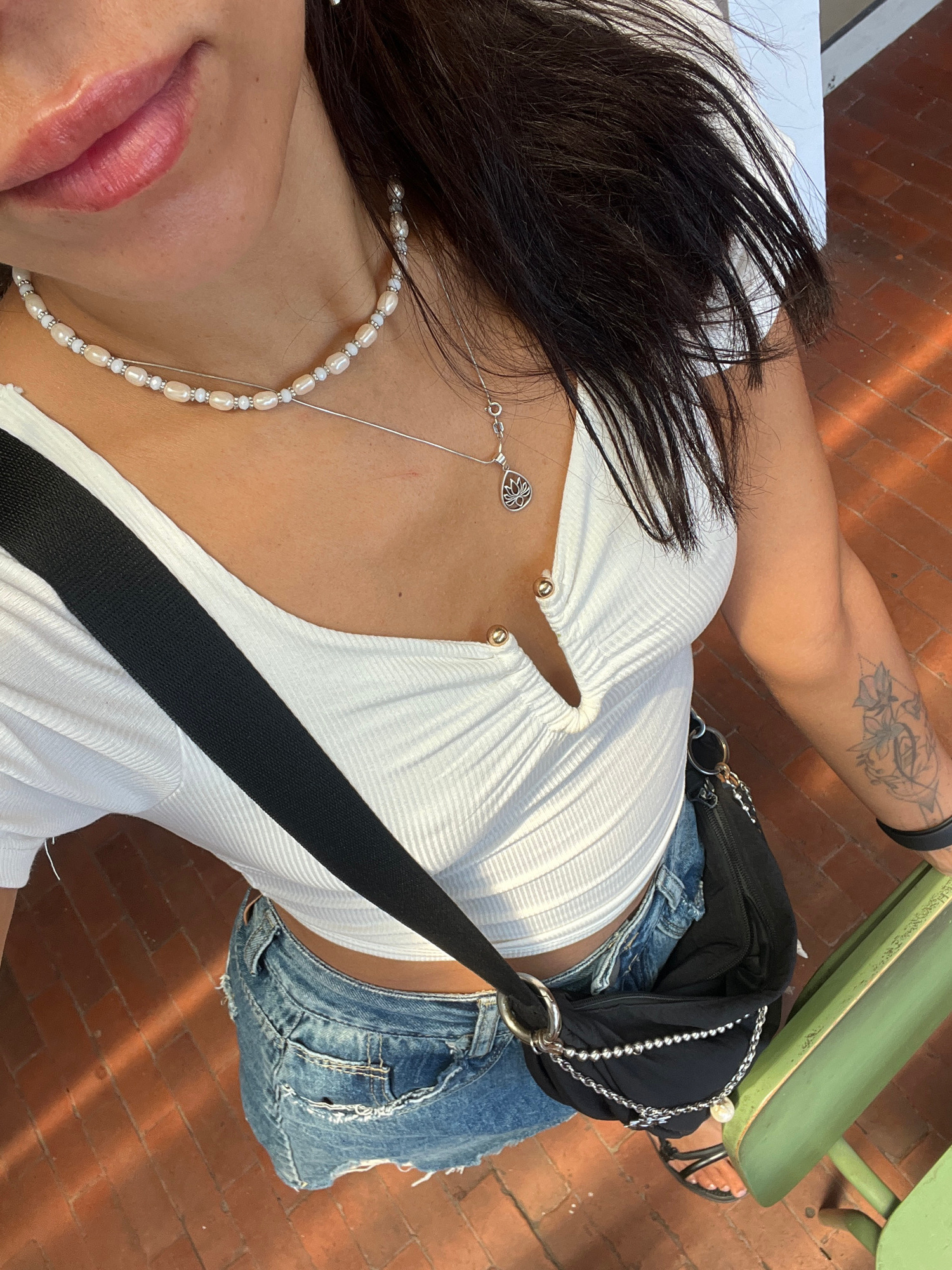 A downward-angled shot captures a partial view of a person seated on a green bench on a brick-paved surface. The individual is wearing a white ribbed top, faded and distressed denim shorts, and a blac…read more