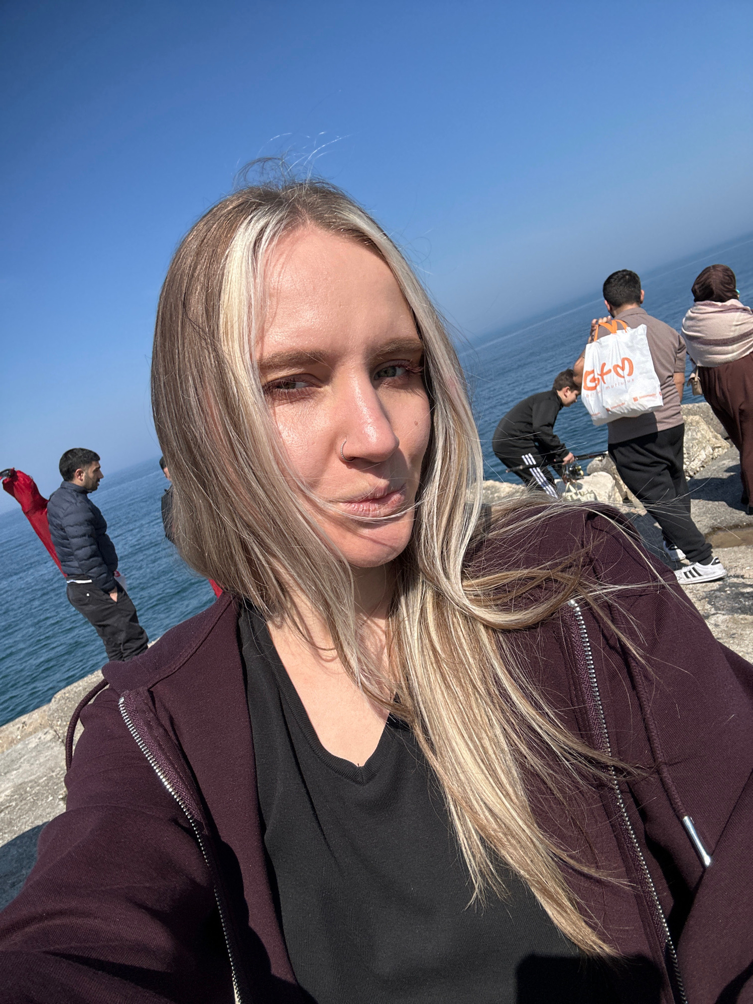 A selfie of a fair-skinned woman with blonde-streaked hair, wearing a black t-shirt and a maroon zip-up hoodie. She is smiling slightly at the camera. In the background, a group of people are standing…read more