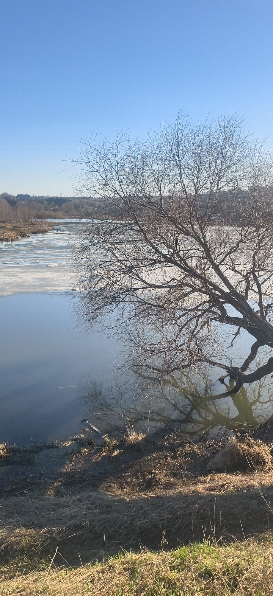 This vertical landscape photograph depicts a tranquil, cold-season scene along a wide river or lake in Фоки, Russia. The dominant subject is a large, bare deciduous tree with a dense network of leafle…read more