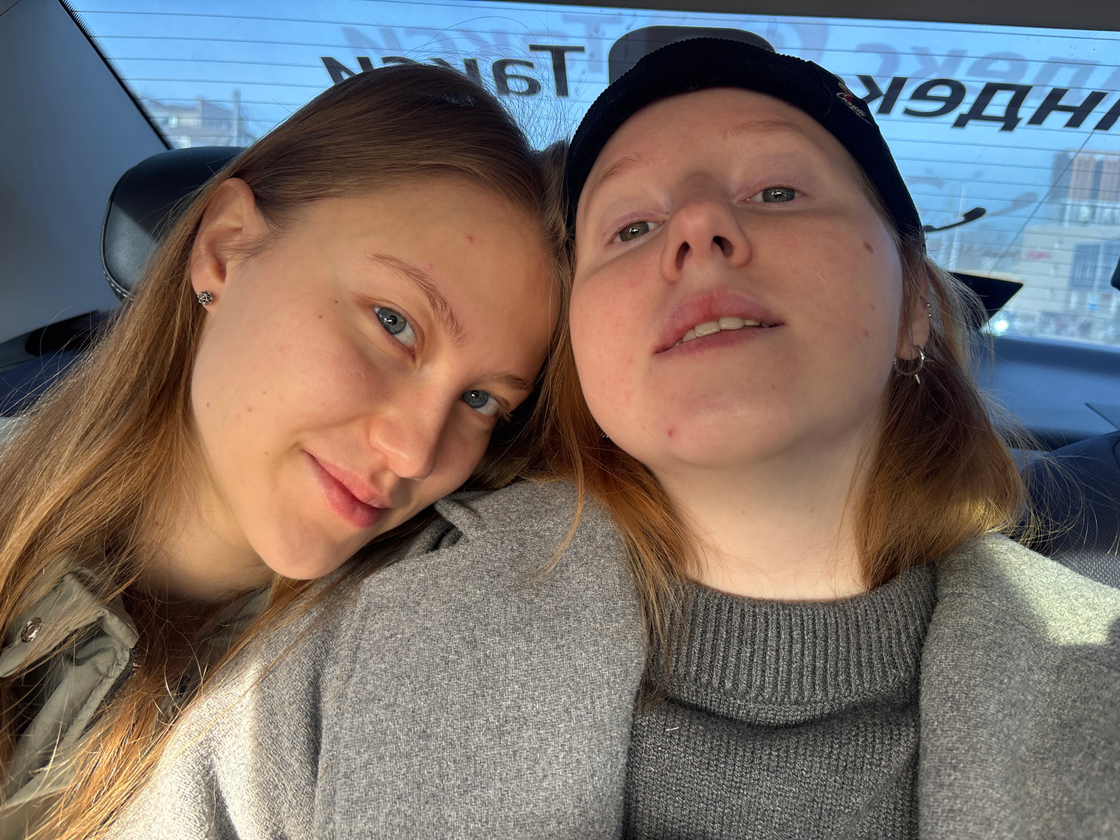 Two young women are posing for a selfie inside a car. The woman on the left has long, light brown hair and blue eyes. She is wearing a light-colored jacket. The woman on the right has reddish-blonde h…read more
