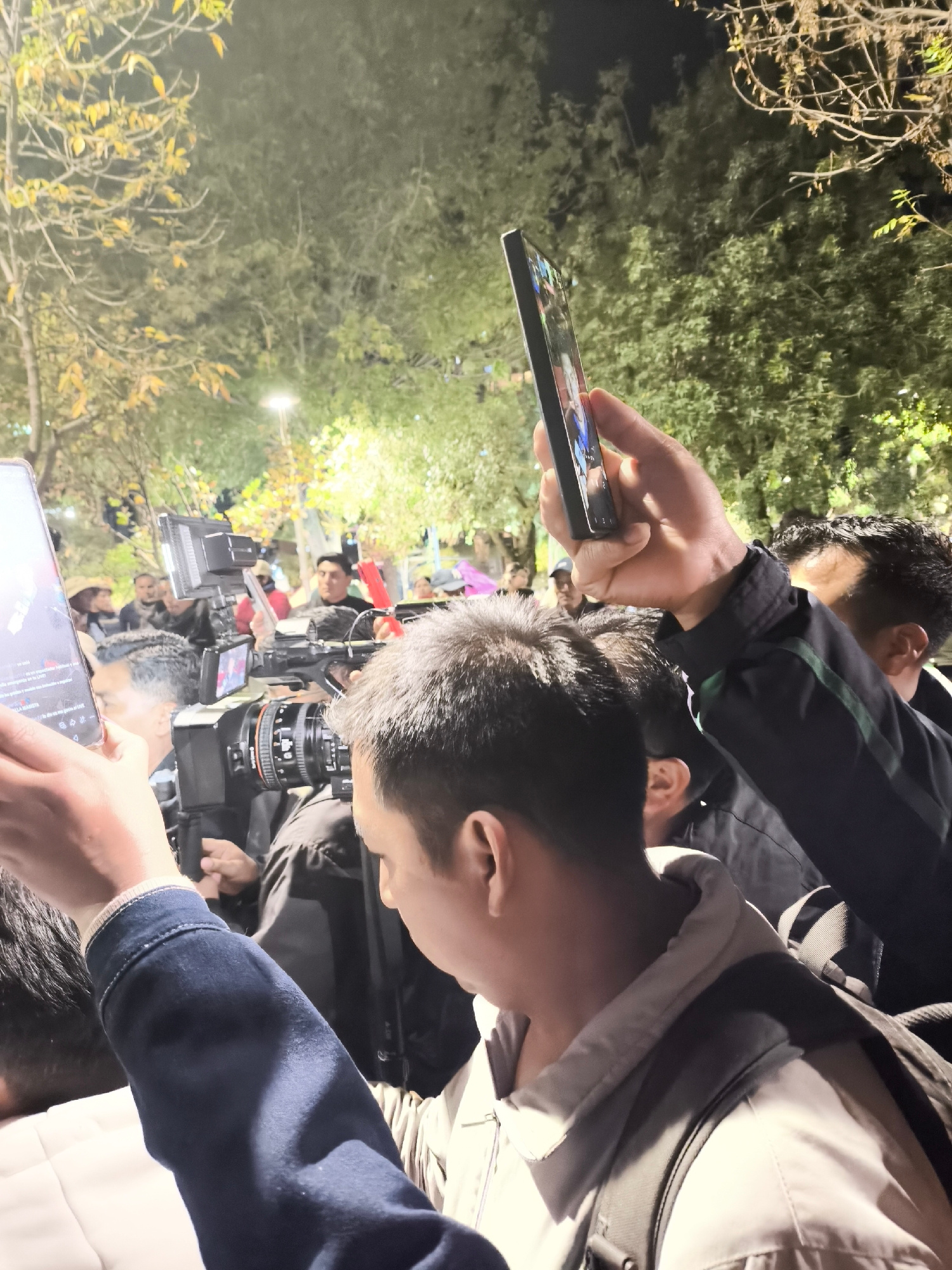 Captured at night in what appears to be an outdoor public space in La Paz, Bolivia, a group of people are gathered, potentially a crowd around a central subject not fully visible. The foreground featuβ¦read more