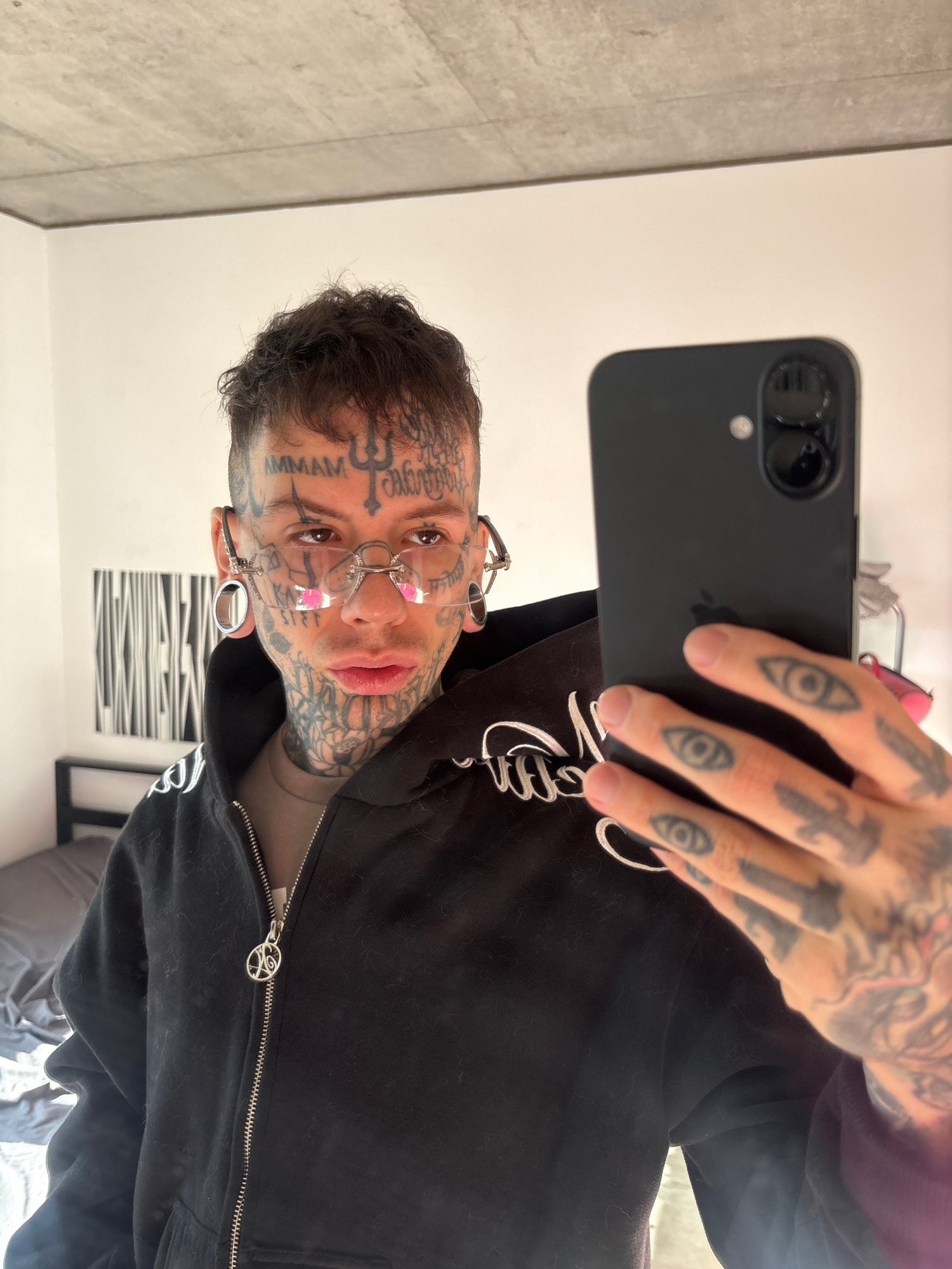 A selfie of a fair-skinned person with extensive tattoos on their face and hands. The person is wearing a black hooded jacket with a silver zipper. Their hair is short and dark. They have stretched ea…read more