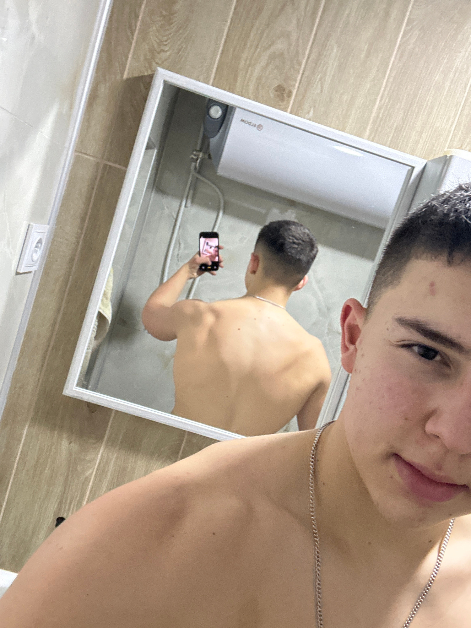 A young man stands in a bathroom, taking a mirror selfie. His torso is bare, and he wears a silver chain necklace. The reflection in the mirror shows him holding a smartphone, presumably taking the ph…read more
