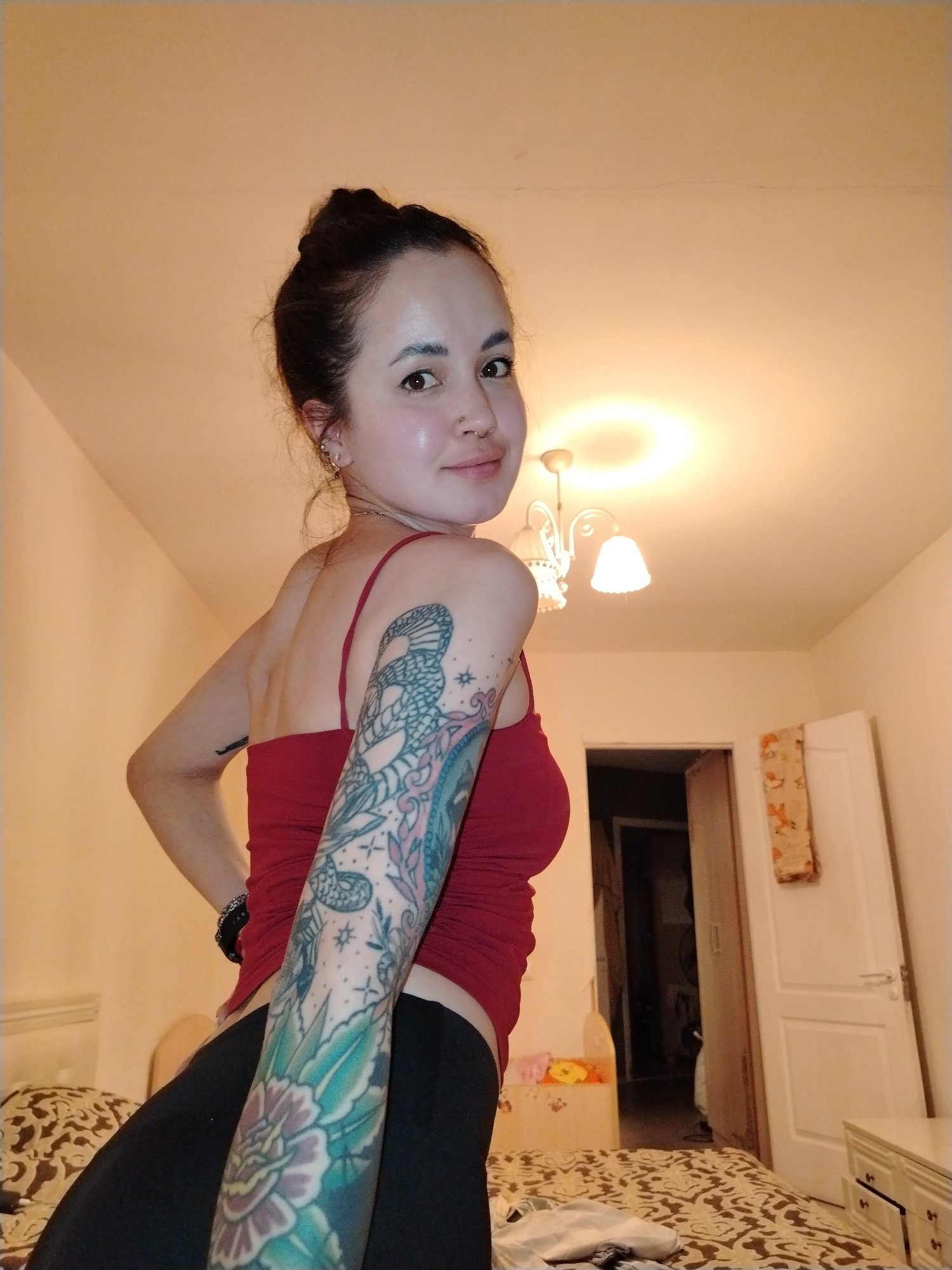 A woman with dark hair pulled into a bun is indoors in what appears to be a bedroom. She is wearing a red tank top and black pants, and has extensive tattoos on her left arm. She is looking over her sβ¦read more
