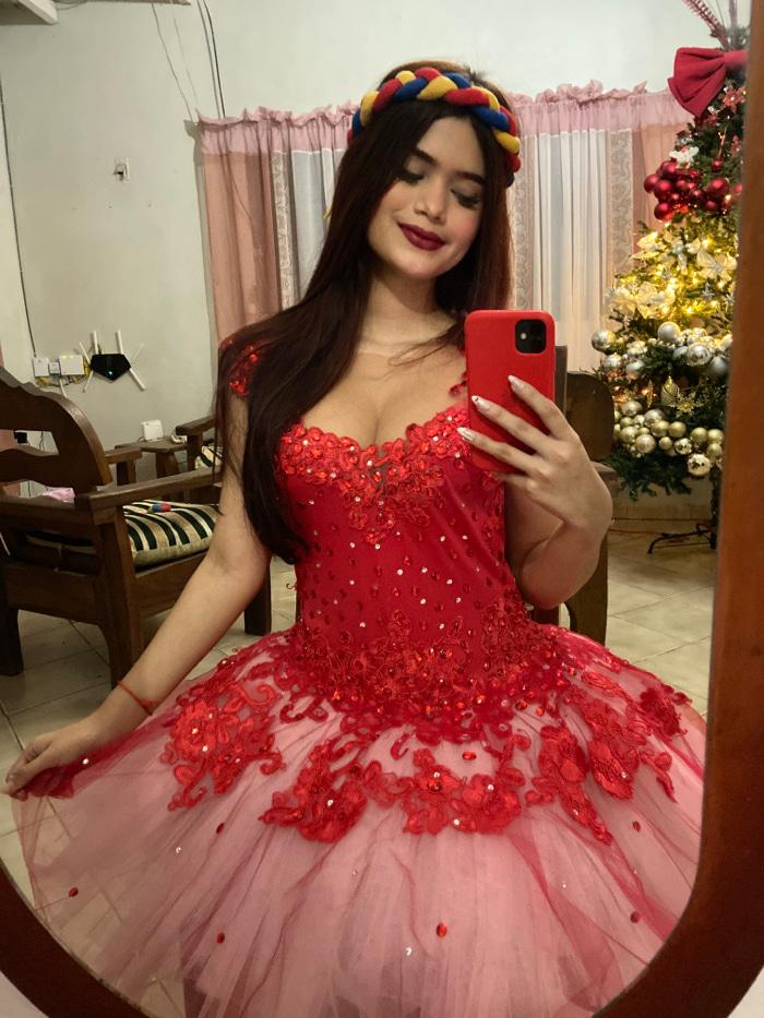 A young woman poses in a mirror selfie, holding a red phone. She wears a red and pink tulle dress adorned with red sequins and floral lace appliques. A colorful braided headband sits atop her long, da…read more