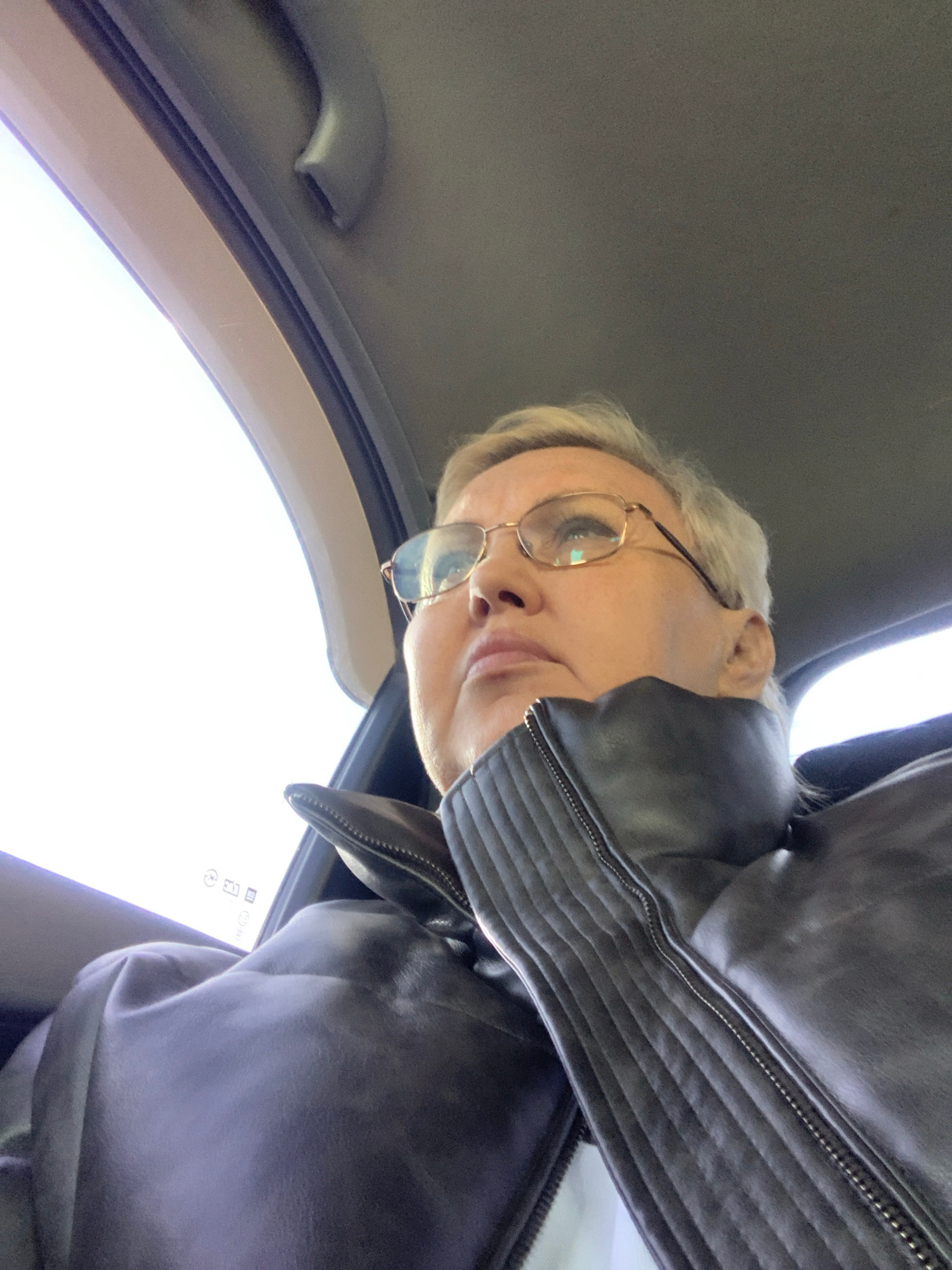 A woman with short blonde hair and glasses is looking down at the camera from inside a car. She is wearing a black leather jacket. The interior of the car is visible, including the roof and the handleβ¦read more