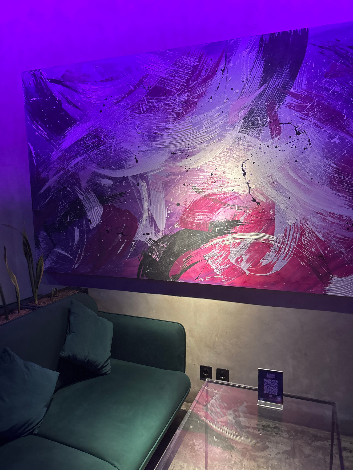 The image shows an interior space in Unknown, Indonesia. On the left is a large abstract painting with bold brushstrokes in shades of white, purple, and pink. The painting is partially illuminated by…read more