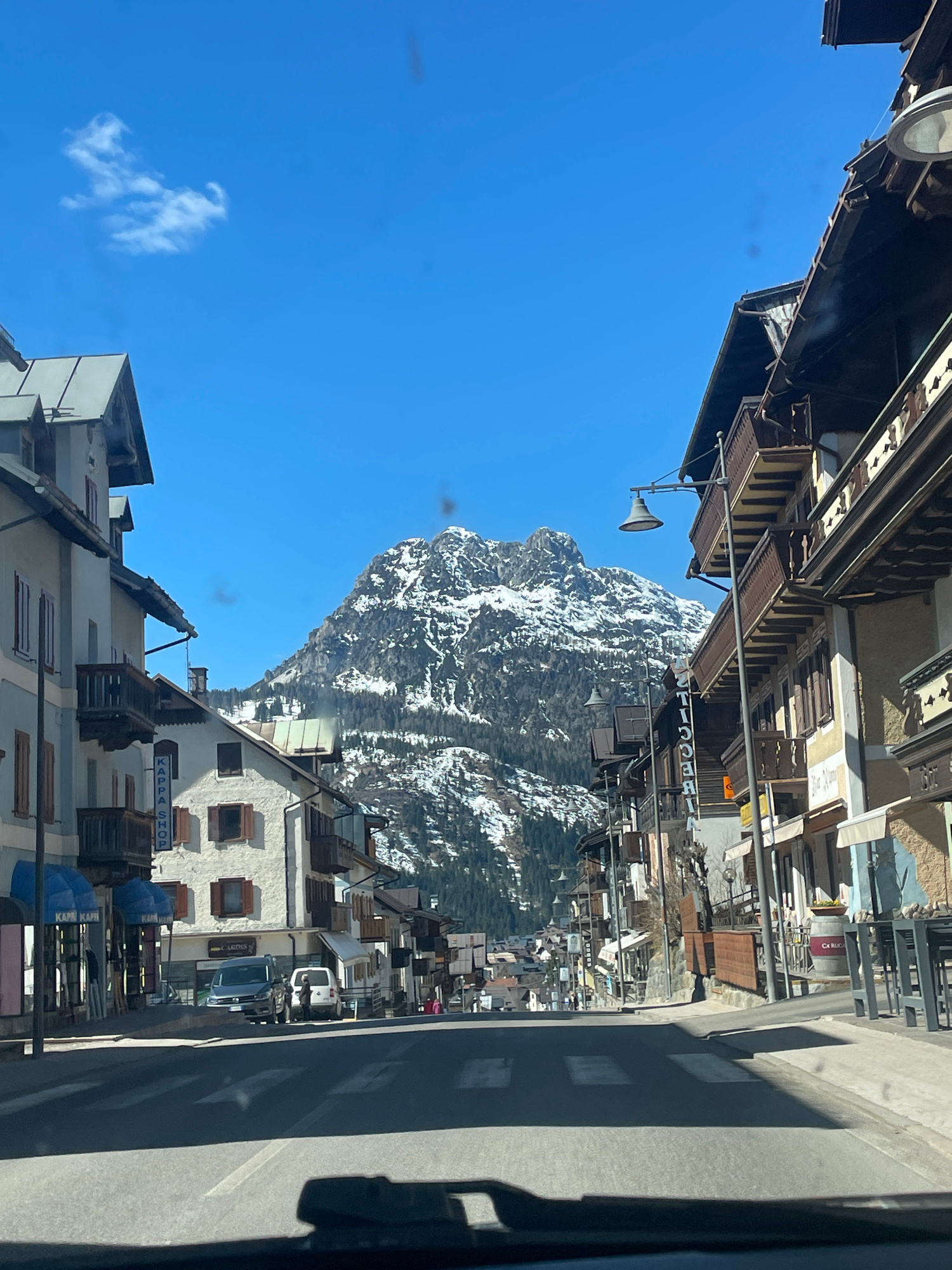 The image shows a view in the town of Sappada, Italy. A snow-covered mountain is visible in the distance, framed by buildings on either side of the street. The buildings appear to be of traditional co…read more