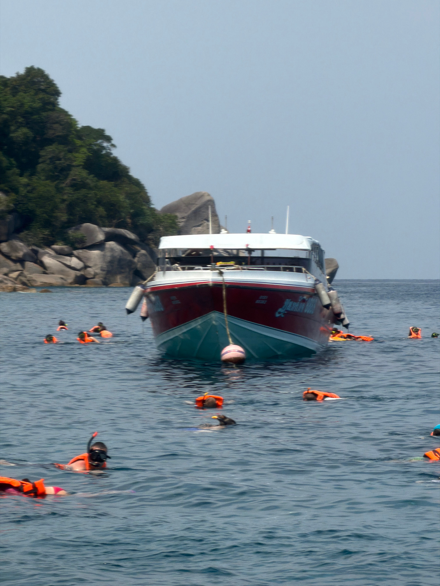 The image displays a marine leisure scene in Unknown, Thailand. A large, red and light blue passenger boat, identified with "Similan Tour" in light blue script on its hull, is stationary in calm, dark…read more