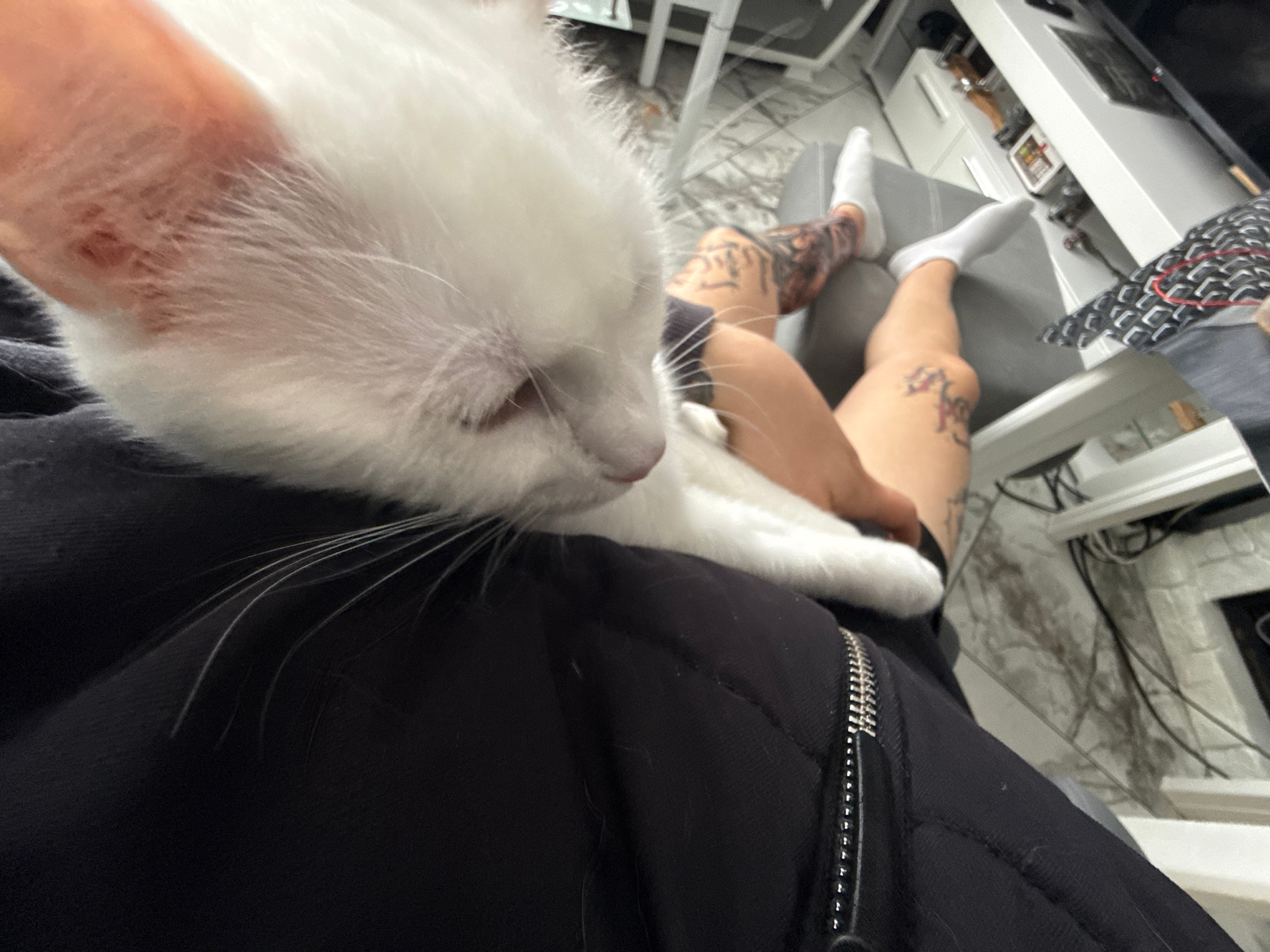A white cat rests on a person's lap, who is seated on a gray couch, wearing white socks. The person has visible tattoos on their legs. The person is wearing a black garment with a zipper. The setting…read more