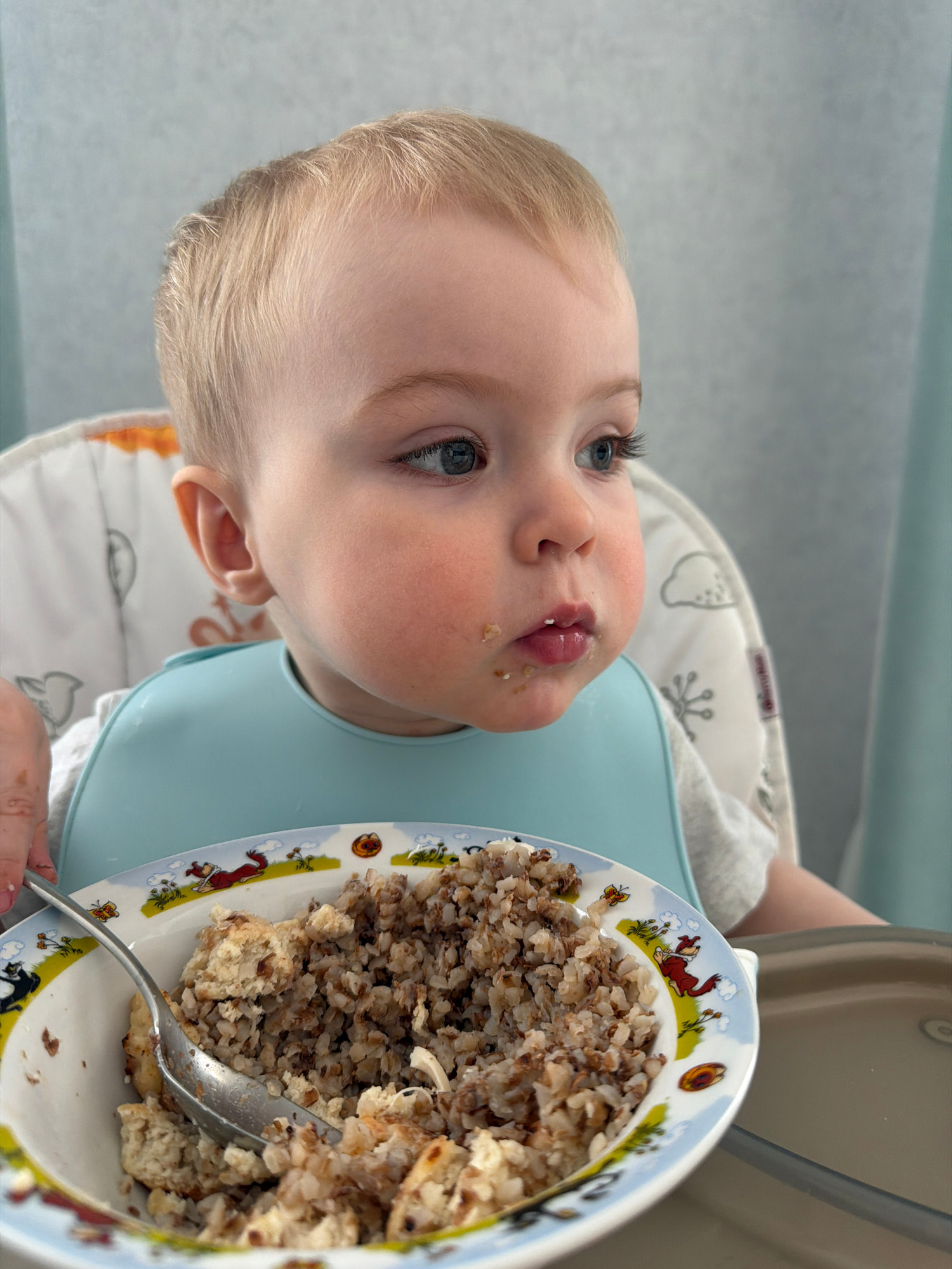 A baby with blonde hair and blue eyes sits in a high chair, wearing a light blue bib. Food residue is visible around the baby's mouth. The baby looks up and slightly to the left. A plate of buckwheat…read more