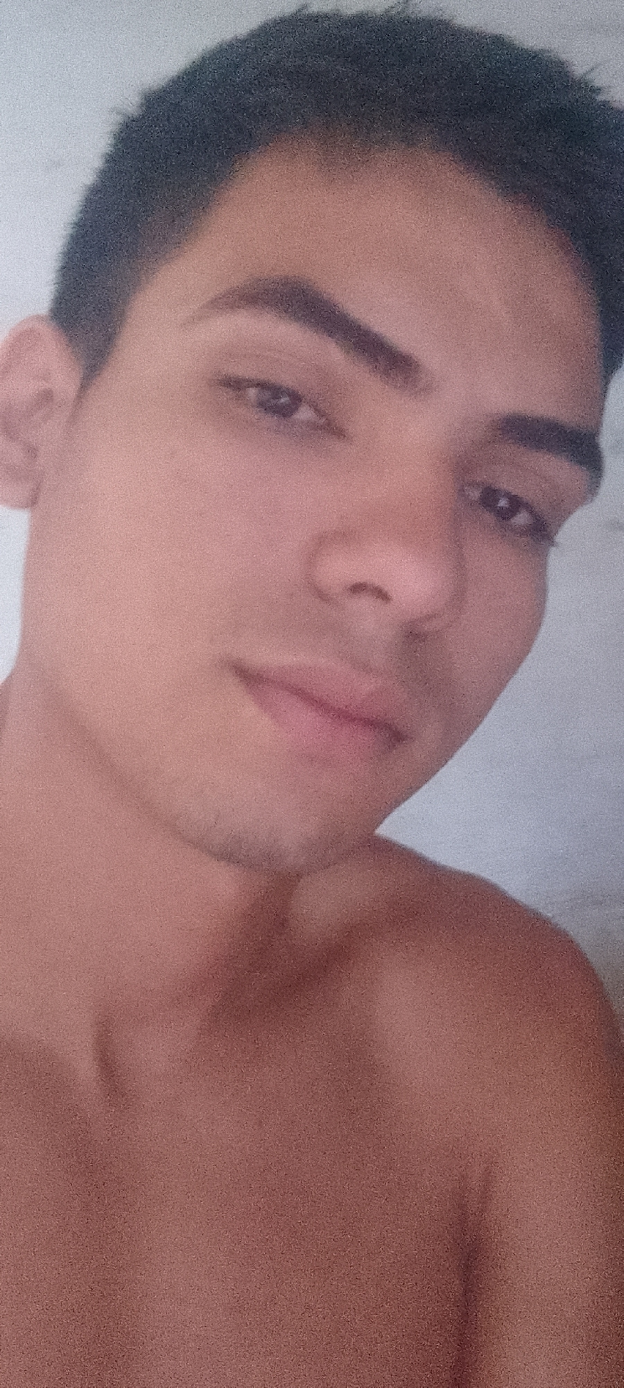 A close-up photograph shows a shirtless young man with dark hair and eyebrows. He is looking directly at the camera. The location and city of Juan Griego, Venezuela, are not discernible in the image.