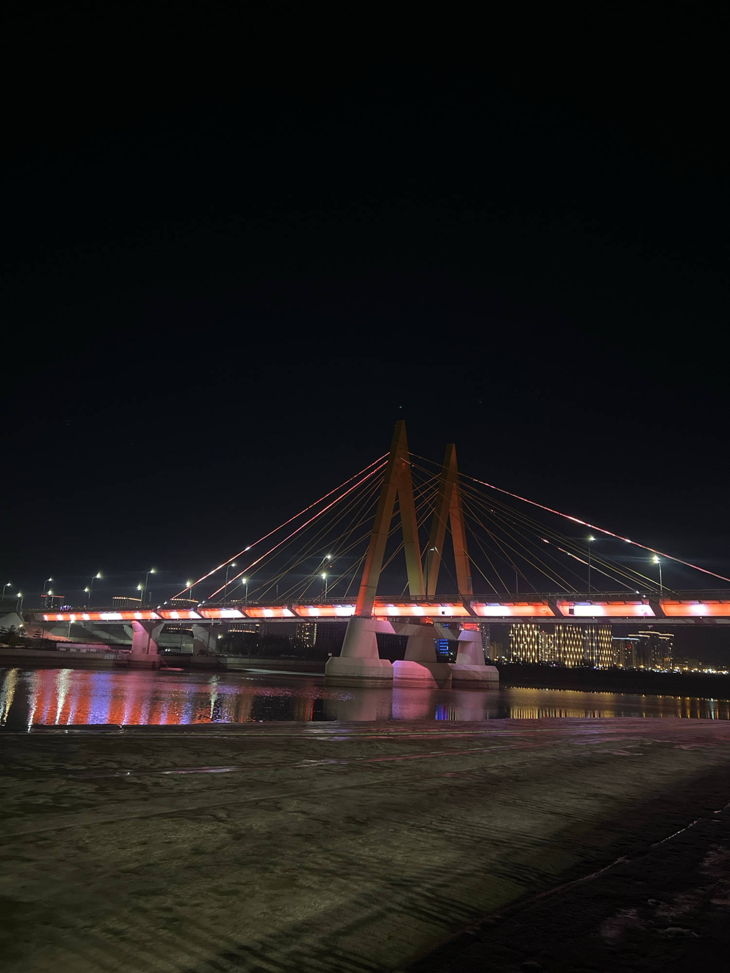 The image shows a brightly lit bridge at night. The bridge has an inverted Y-shaped support structure at the top, with cables extending downwards from the support to the road surface. The support and…read more
