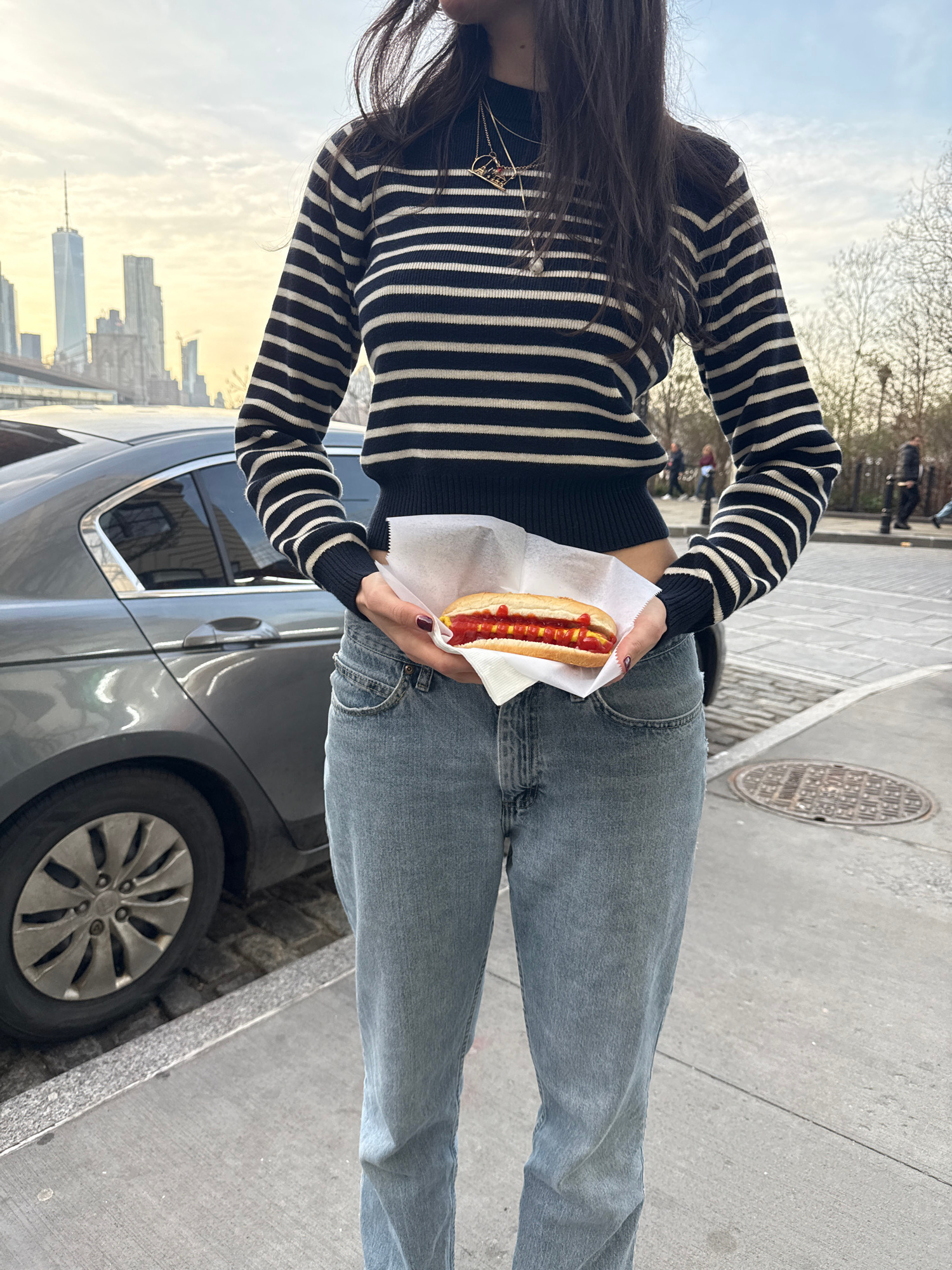 A woman stands on a sidewalk in New York City, holding a hot dog in a paper wrapper. She is wearing a black and white striped long-sleeve shirt and light blue jeans. The skyline of Lower Manhattan, in…read more
