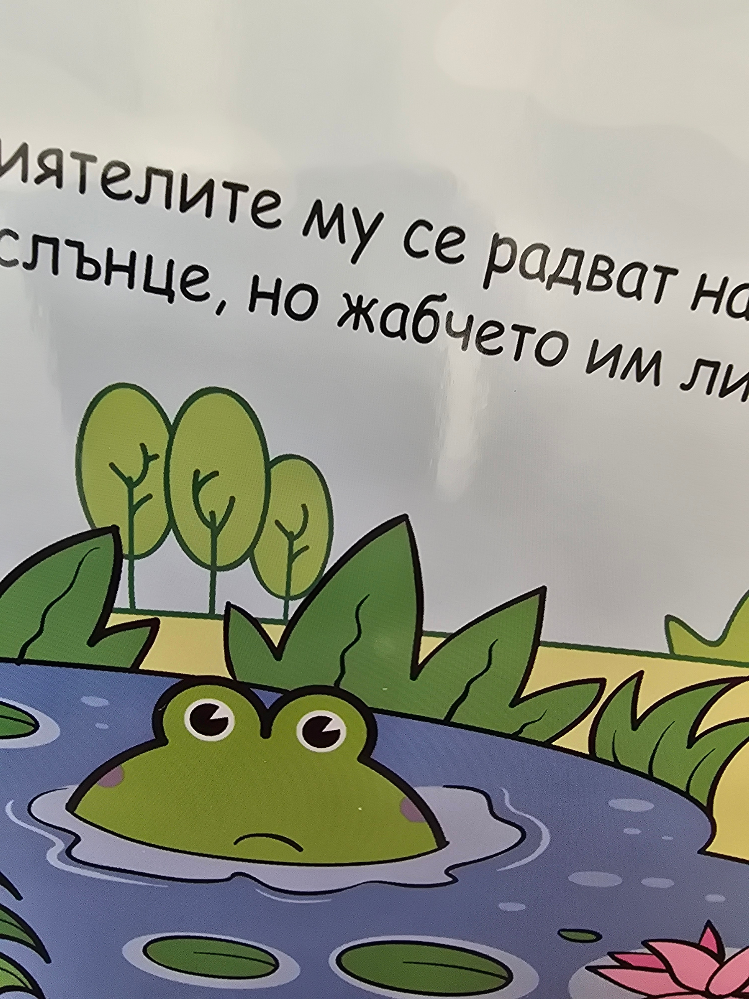 The image depicts a cartoon frog partially submerged in a blue pond with lily pads, surrounded by green foliage and small cartoon trees. Text in Bulgarian is visible on the left side of the image.