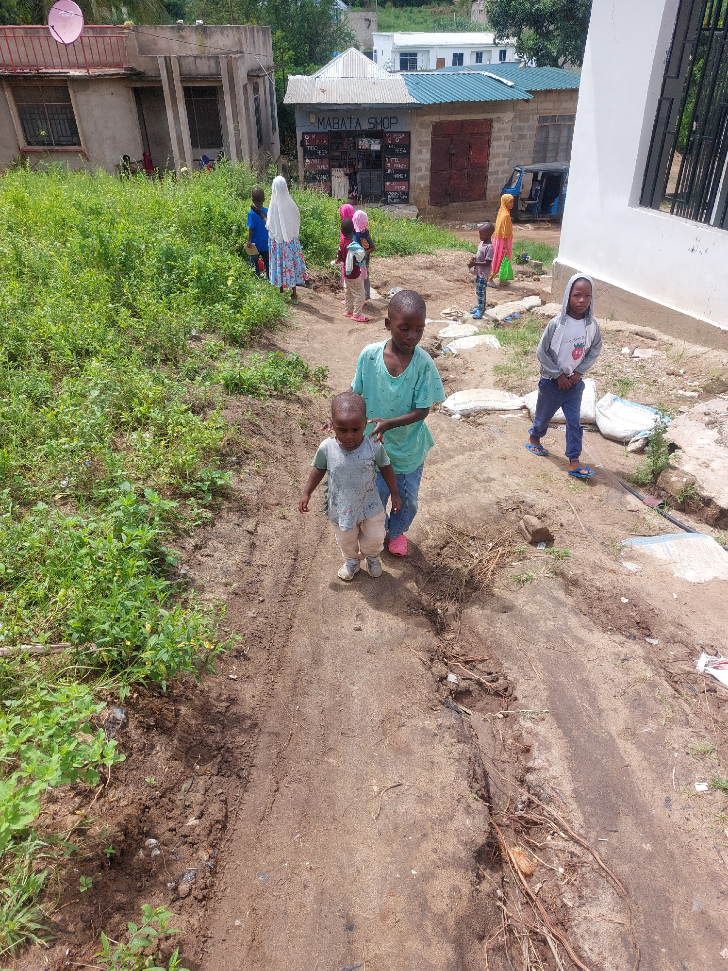 The image shows a dusty path in an urban area, likely in Dar es-Salaam, Tanzania, given the visible signs of Tanzanian commerce such as the "Mabata Shop" sign advertising "Tigo Pesa" and "Airtel Money…read more