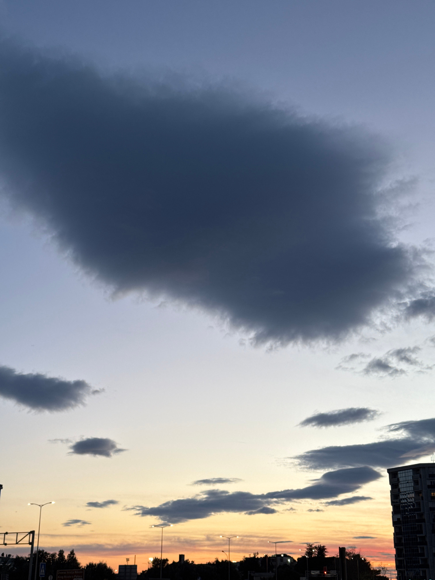 The image captures a view of the sky at dusk in Bjeliši, Montenegro. The sky transitions from a light blue-gray on the left to a warm yellow-orange near the horizon on the right. A large, dark gray cu…read more