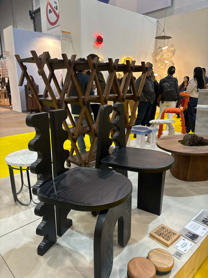 An exhibition space features avant-garde furniture. A slatted wood structure stands tall, while unique black wooden chairs with cutout details are positioned nearby. Round wooden tables and accessorie…read more