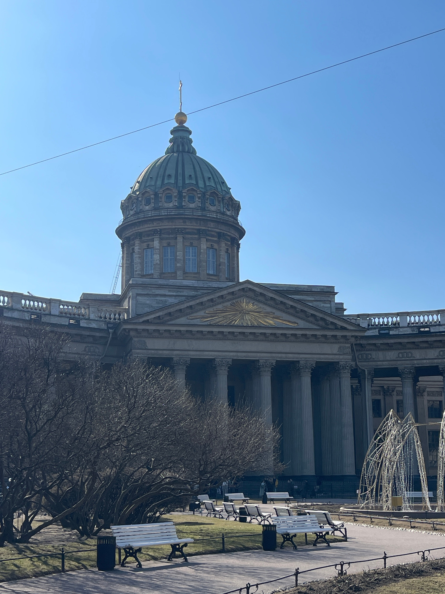 The image shows the Kazan Cathedral in Saint Petersburg, Russia, viewed from a ground-level perspective. The cathedral's dome, adorned with a golden spire, dominates the left side of the image against…read more