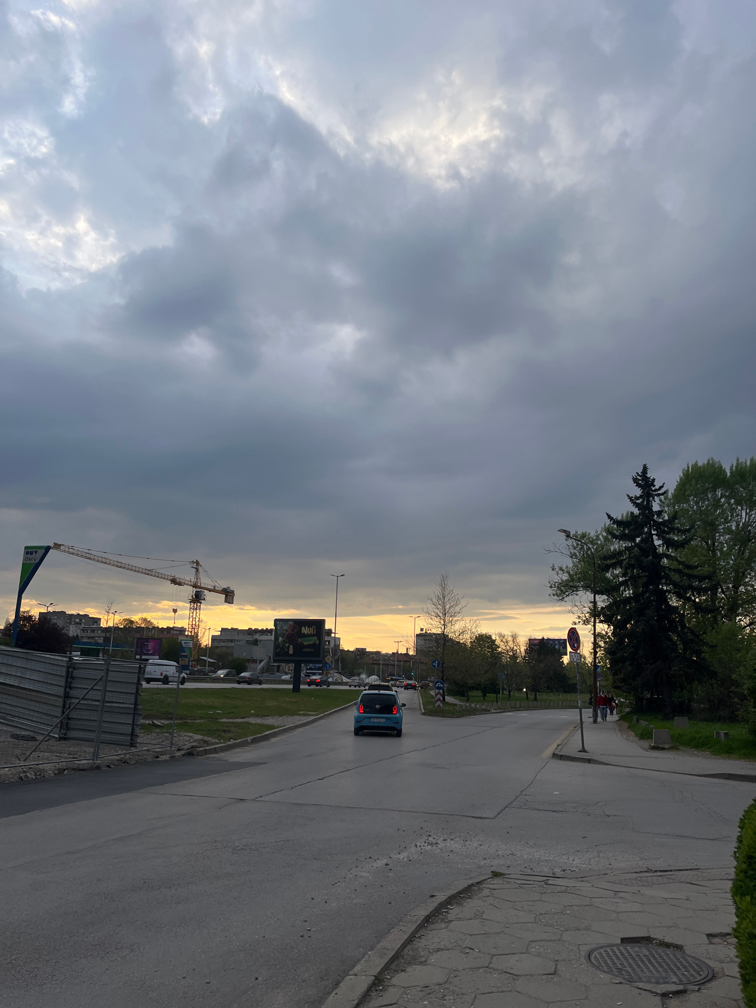 This image presents an urban street scene under a dramatic, cloudy sky, likely captured during late afternoon or early evening. The upper and left portions of the sky are dominated by heavy, dark grey…read more