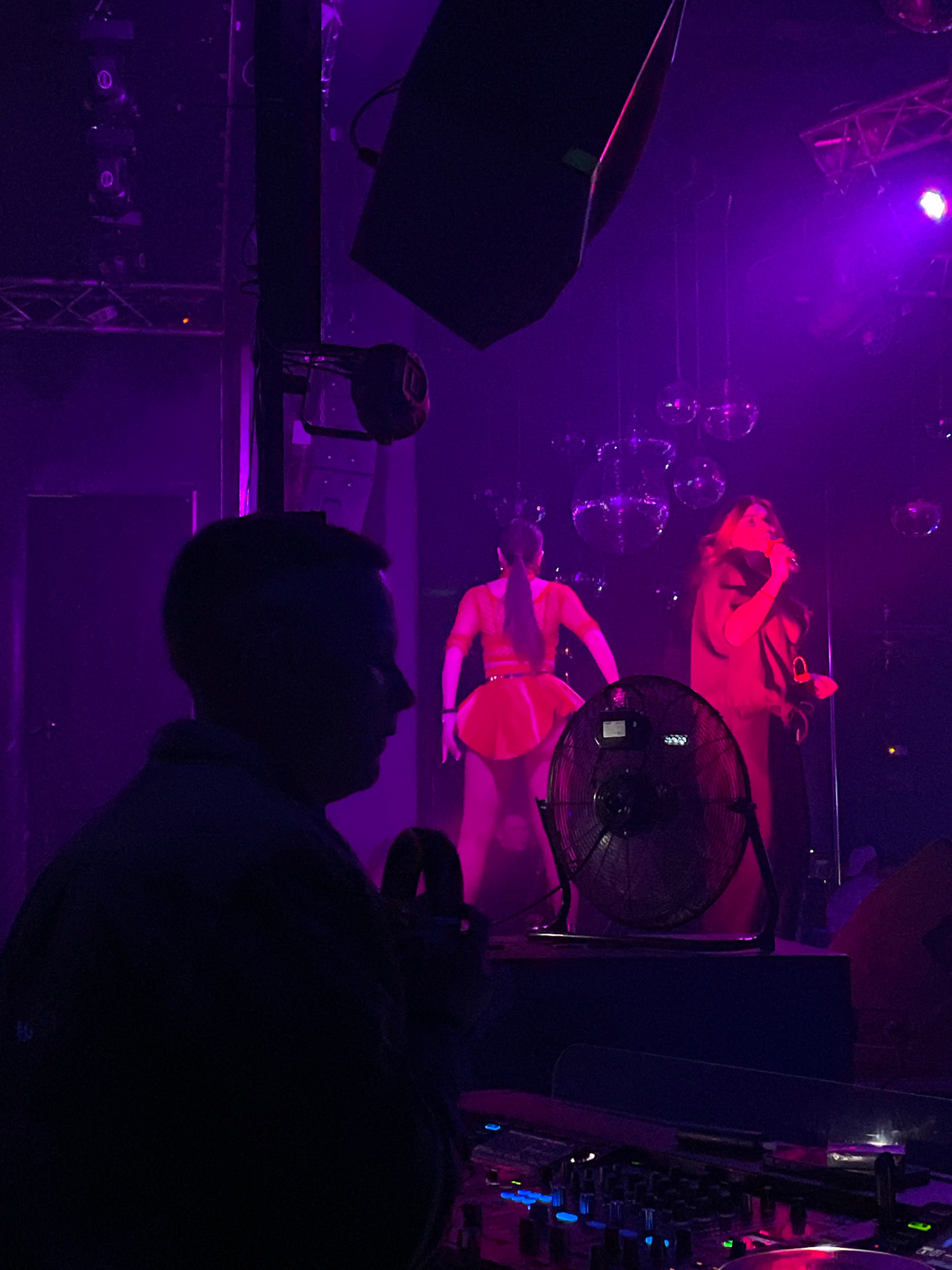 The image depicts a dimly lit club or concert venue in Moscow, Russia, illuminated predominantly by purple and magenta stage lighting. In the foreground, a silhouetted male DJ, viewed in profile facinβ¦read more