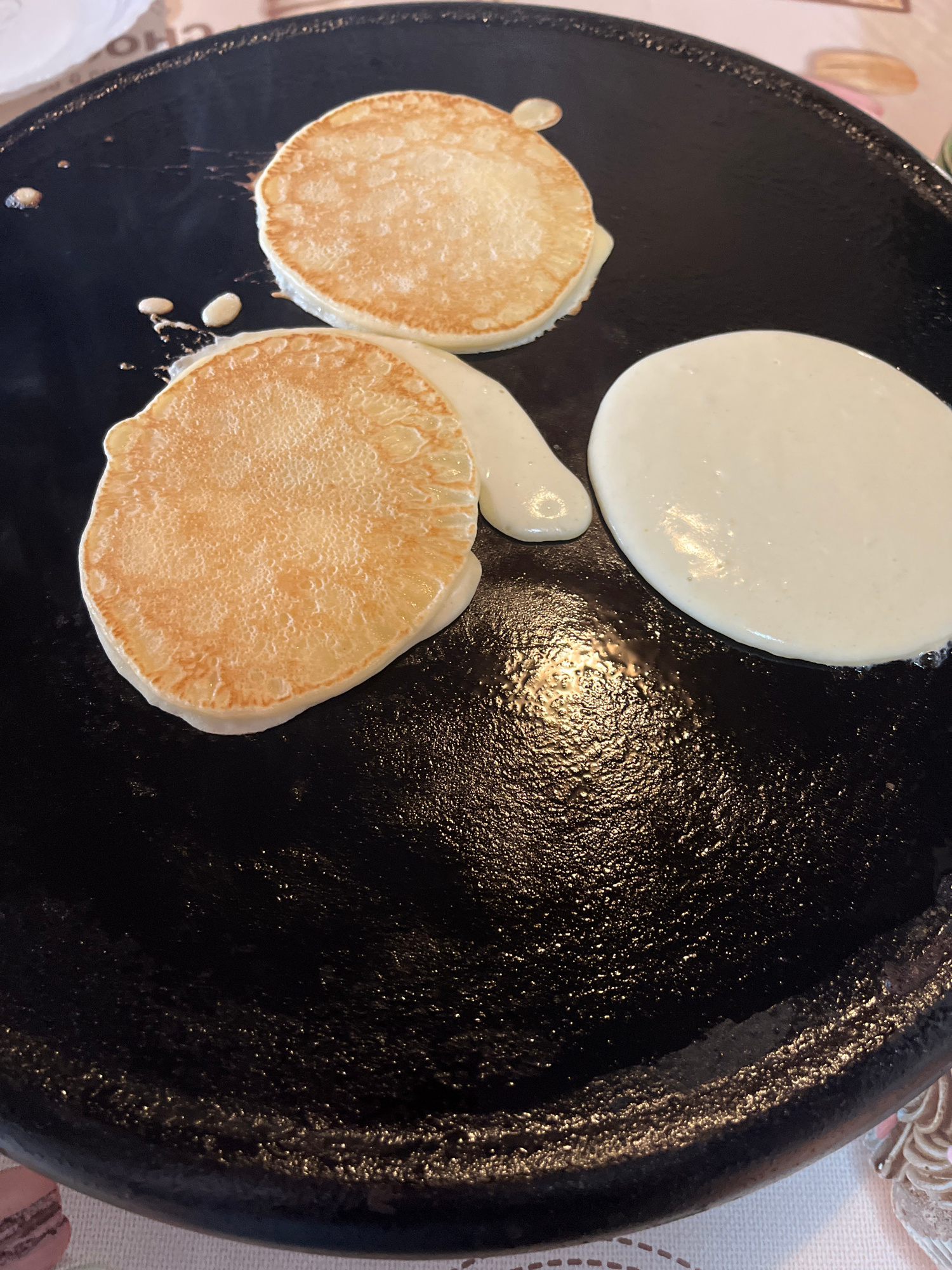 The image shows a black, presumably non-stick, crepe pan or griddle. There are three portions of pancake batter on the pan. Two of the portions have been cooked to a light golden-brown on at least one…read more