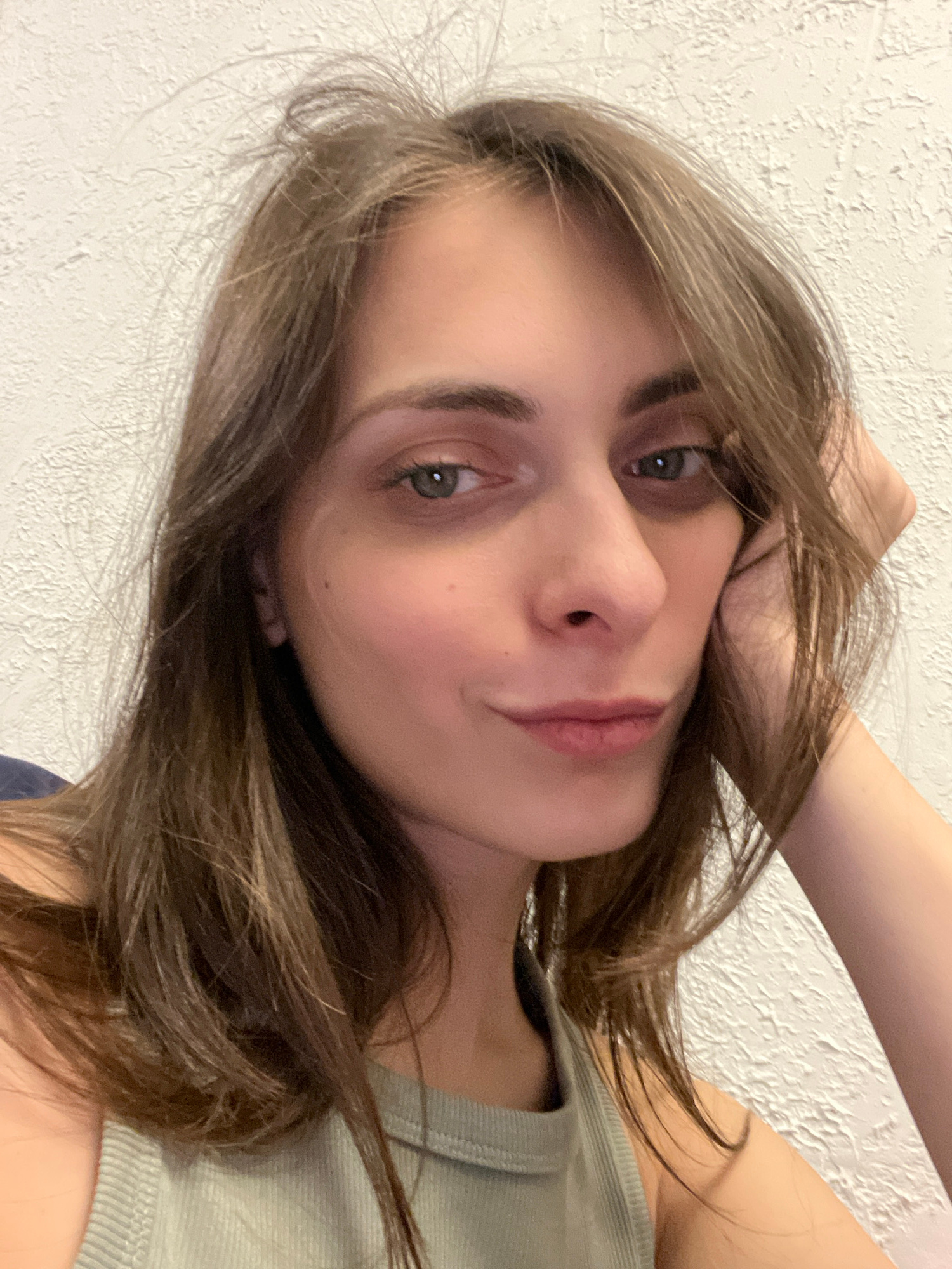 A close-up, rotated selfie of a fair-skinned woman with light brown hair. She is wearing a light green tank top. Her left hand is near her head, possibly touching her hair. The background is a texture…read more