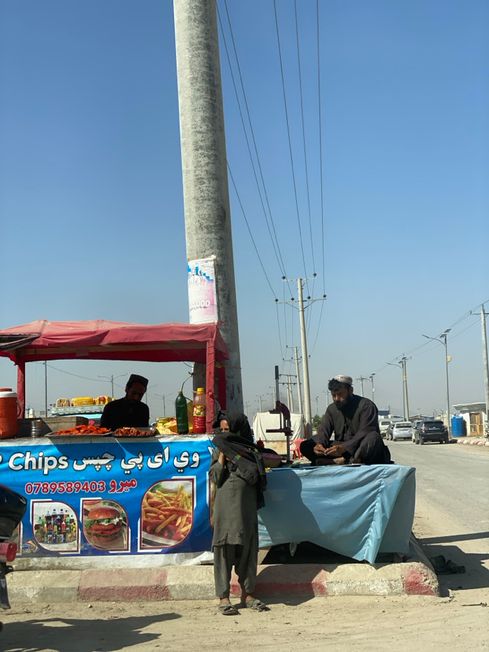 The scene depicts a sunny roadside marketplace in Qazi Kariz, Afghanistan, under a clear blue sky. In the foreground, a large, weathered grey utility pole with a partially torn advertisement on its ba…read more