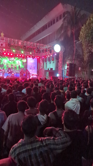 The image depicts an outdoor night concert or event in Dhaka, Bangladesh, with a large, dense crowd of individuals, predominantly young adults, facing a brightly lit stage. The audience, seen mostly f…read more