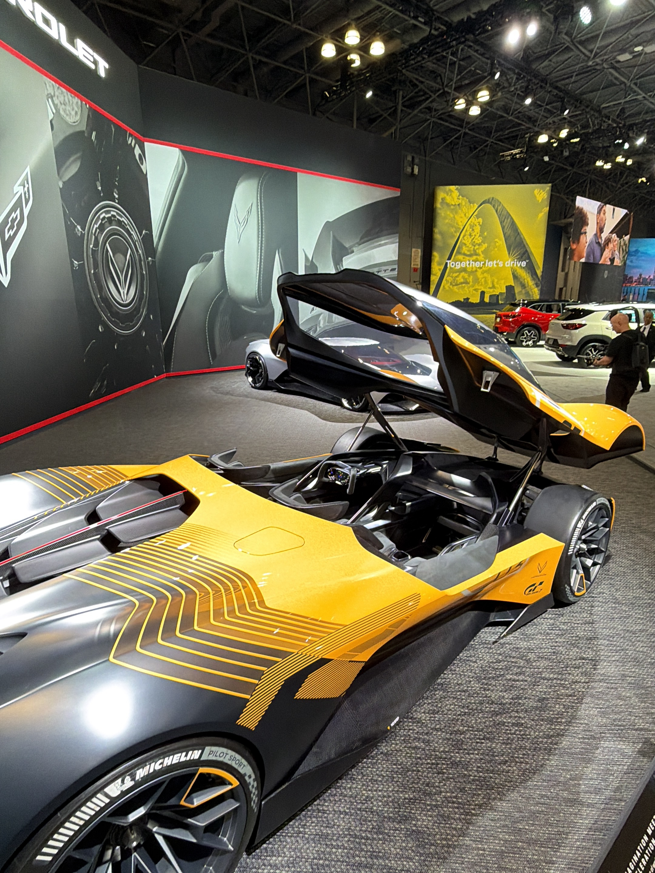 The image shows a two-seater Chevrolet Chaparral Vision Gran Turismo concept car at the 2024 New York International Auto Show, which took place at the Jacob K. Javits Convention Center in New York Cit…read more