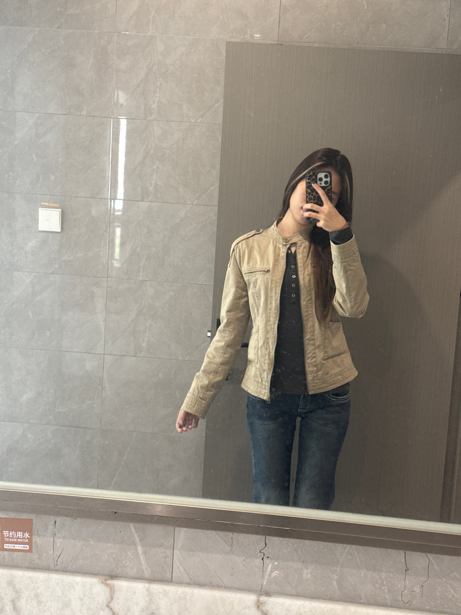 The image shows a person taking a mirror selfie in a tiled bathroom. The person is wearing a tan jacket, a black top, and blue jeans. They are holding a smartphone with a patterned case up to their fa…read more
