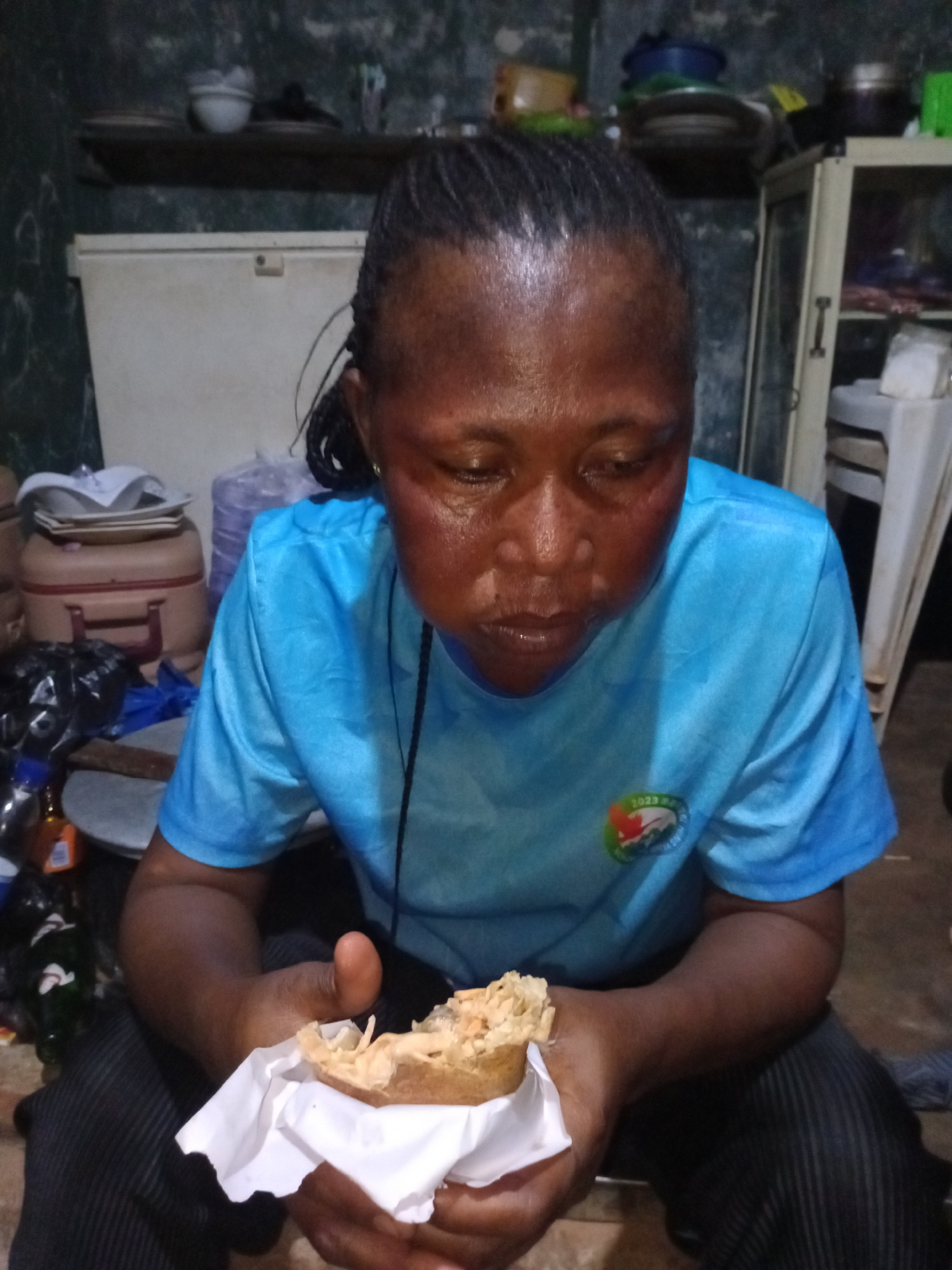 A woman with braided hair sits indoors, wearing a blue t-shirt, and holds a snack wrapped in white paper. The location appears to be a room with miscellaneous items scattered around, possibly in Ikoro…read more