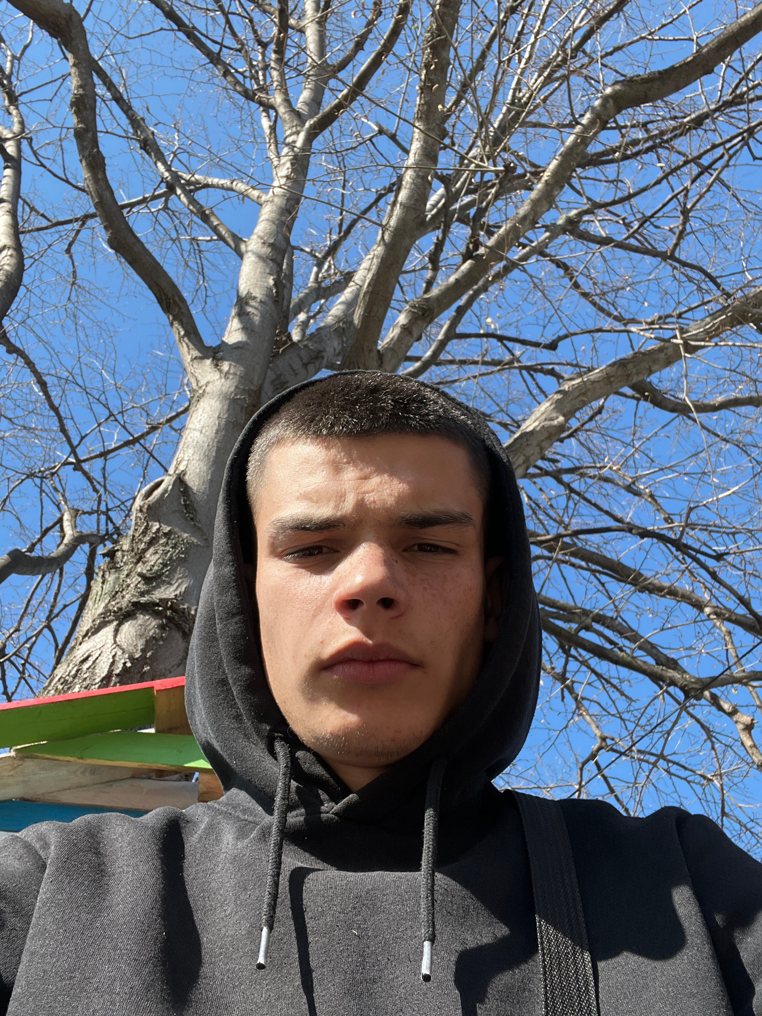 A young man with short dark hair and a black hoodie is looking at the camera. He is standing outdoors under a bare tree with many branches against a bright blue sky. In the lower right of the image, t…read more
