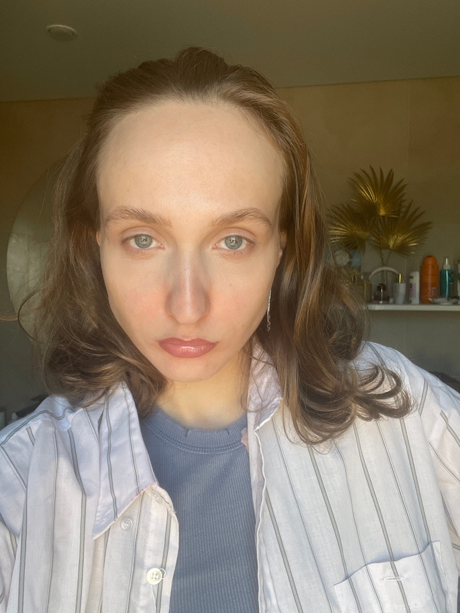 A woman with light skin, green eyes, and light brown hair is seen in a close-up, rotated portrait. She has a natural lip color, and a hint of pink blush on her cheeks. She is wearing a blue top under…read more