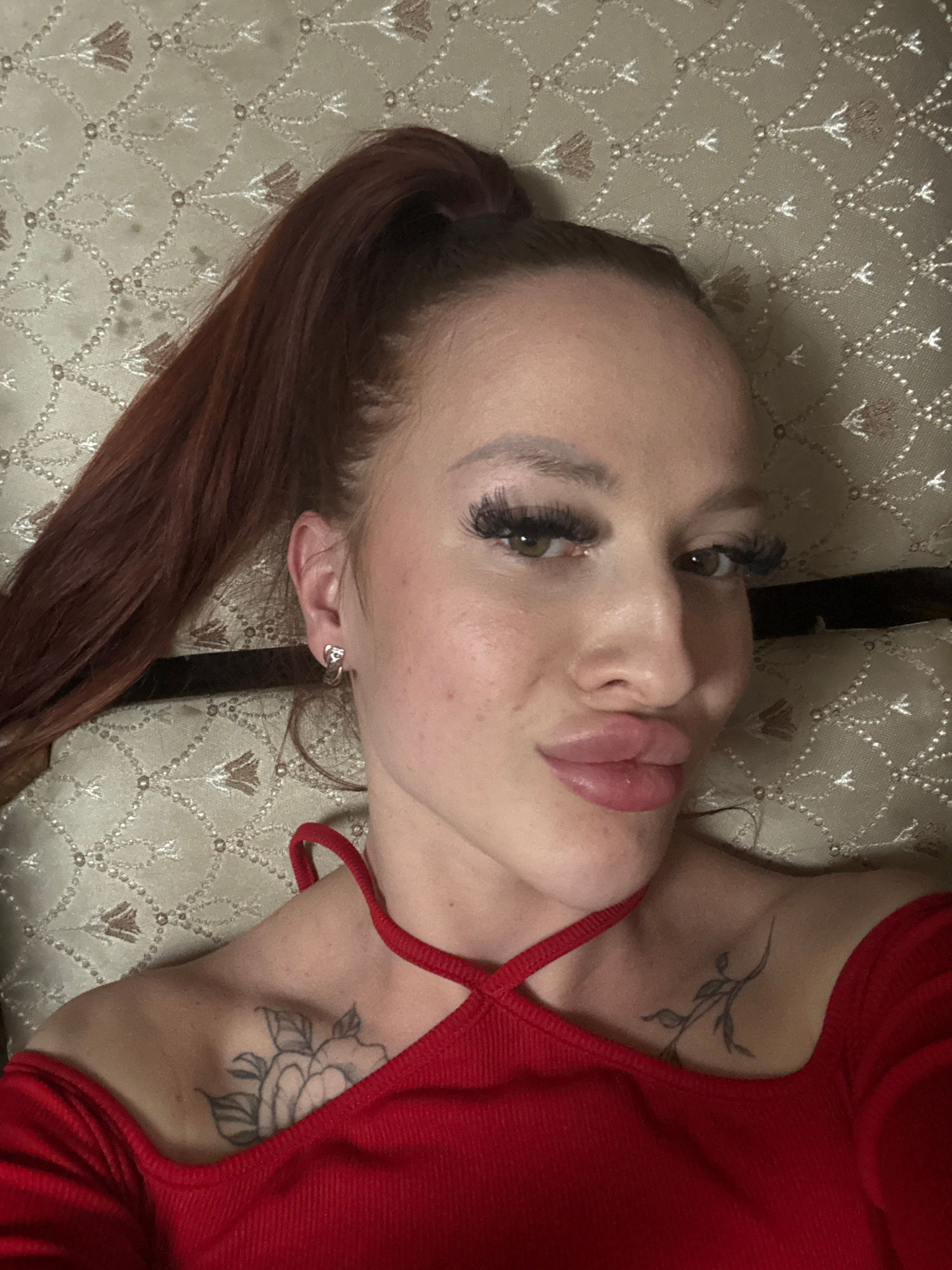 A woman with auburn hair pulled back in a ponytail is lying on a light-colored patterned surface. She wears a red top. She has tattoos on her neck and upper chest. She is looking at the camera with liβ¦read more