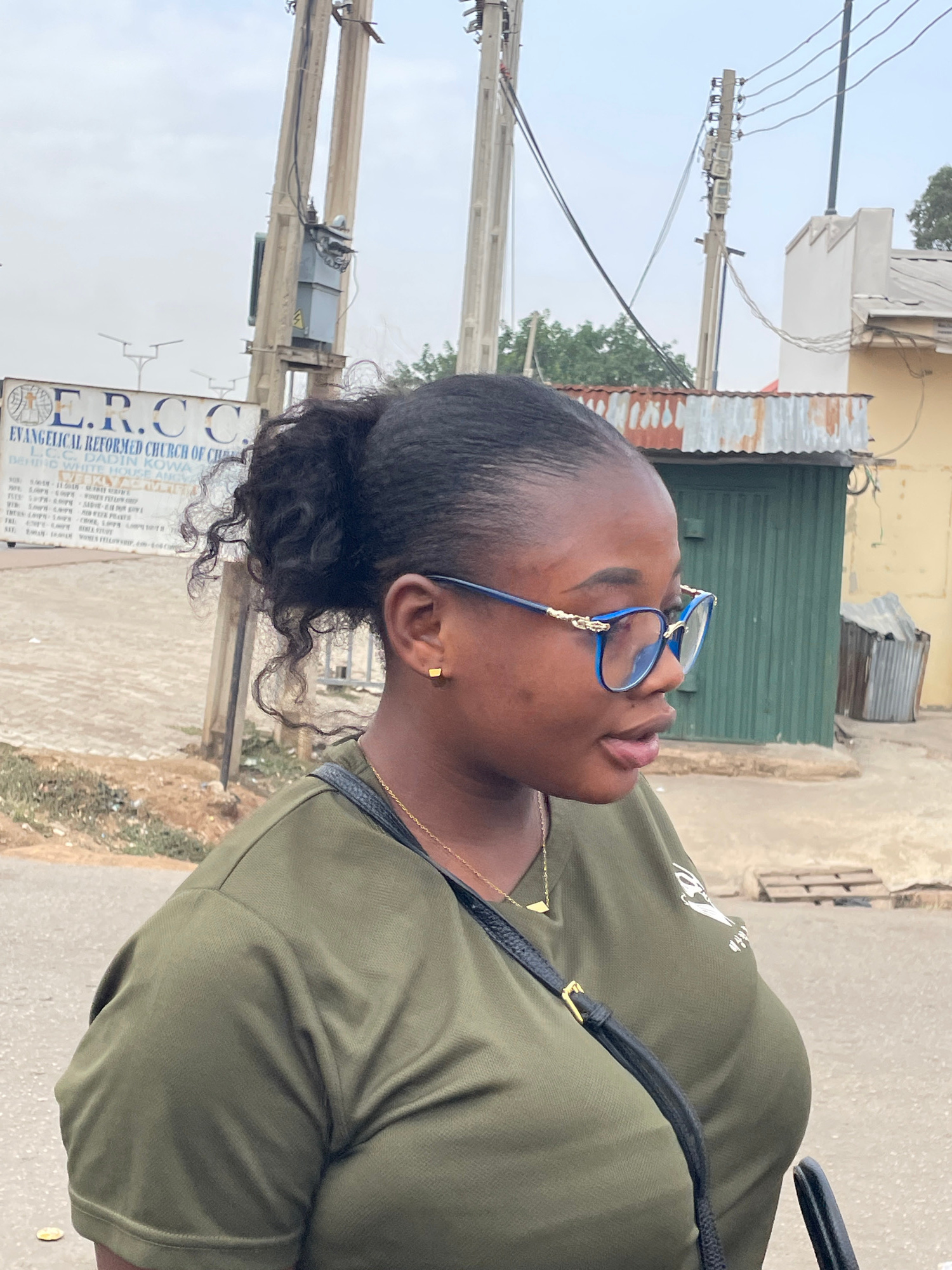 The image shows a woman wearing glasses, an olive green shirt, and a black shoulder bag, captured in Jos, Nigeria. In the background, an Evangelical Reformed Church sign is visible, reading "E.R.C C Eā¦read more